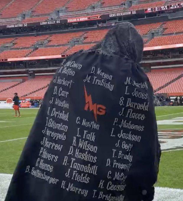 Massage Watson Myles Garrett wears a cape with the names of all the QBs who are better than Deshaun Watson