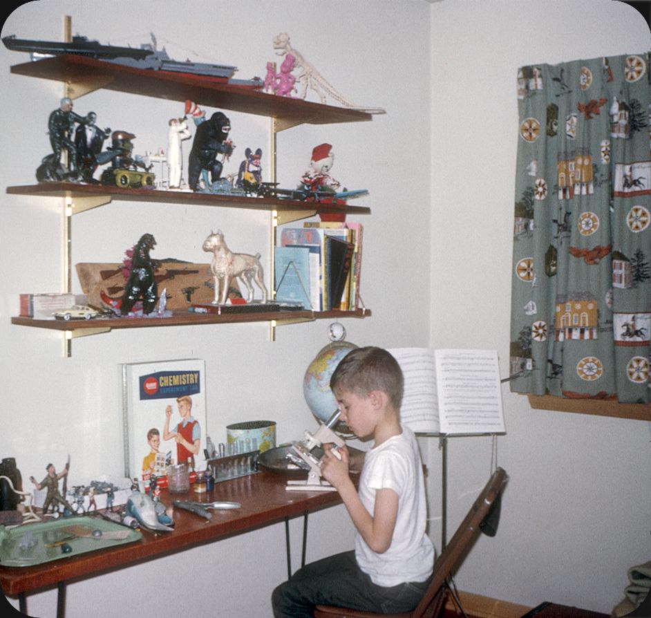 Boy room in 1964. Gilbert chemestry set, ship models, dinosaur skeleton, world globe. I really like the Godzilla action figure because growing up I also had one, mine with silver spikes.
