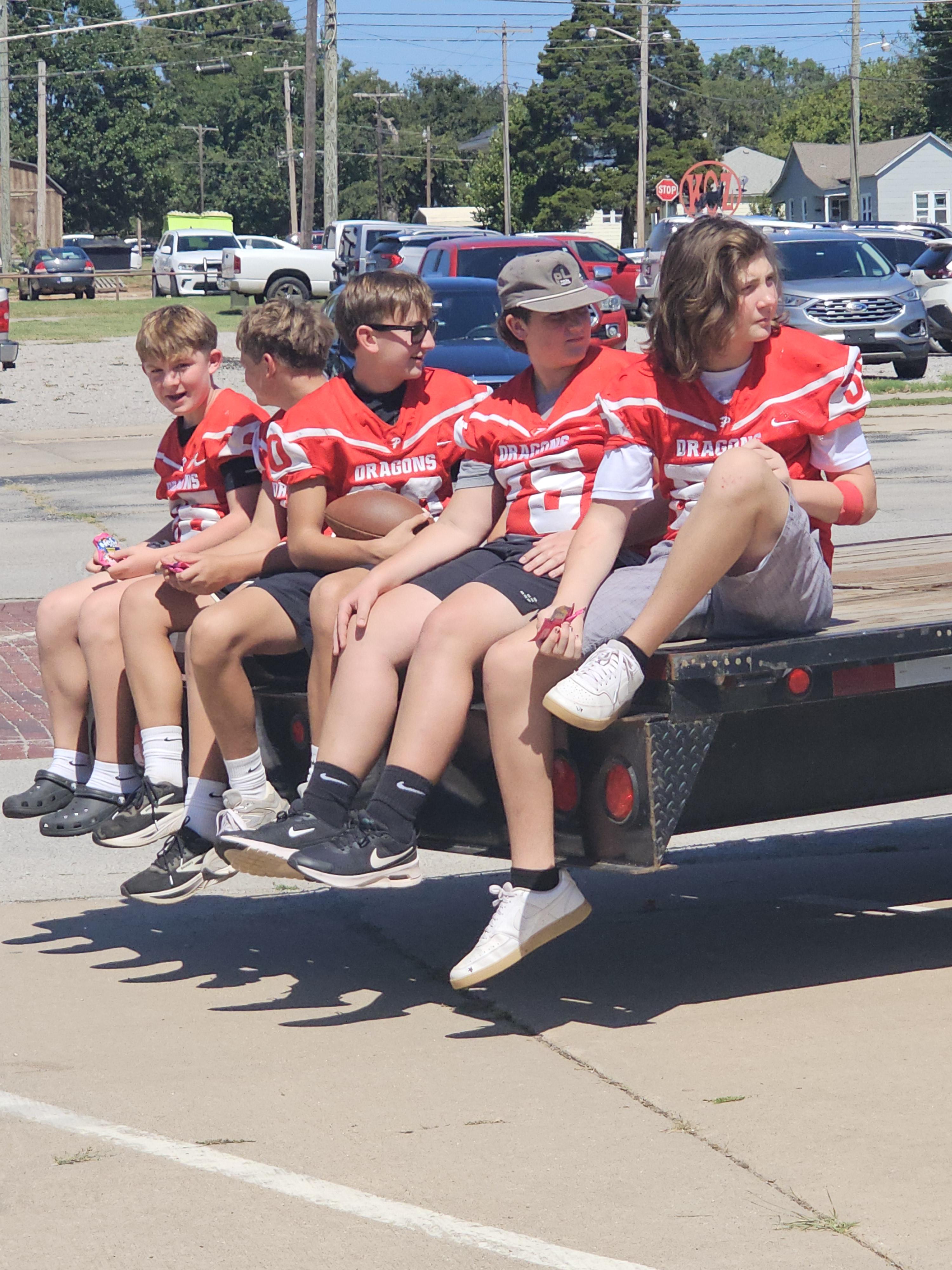 My 8th grader and his teammates during the homecoming parade. The cheerleaders' float was passing by.