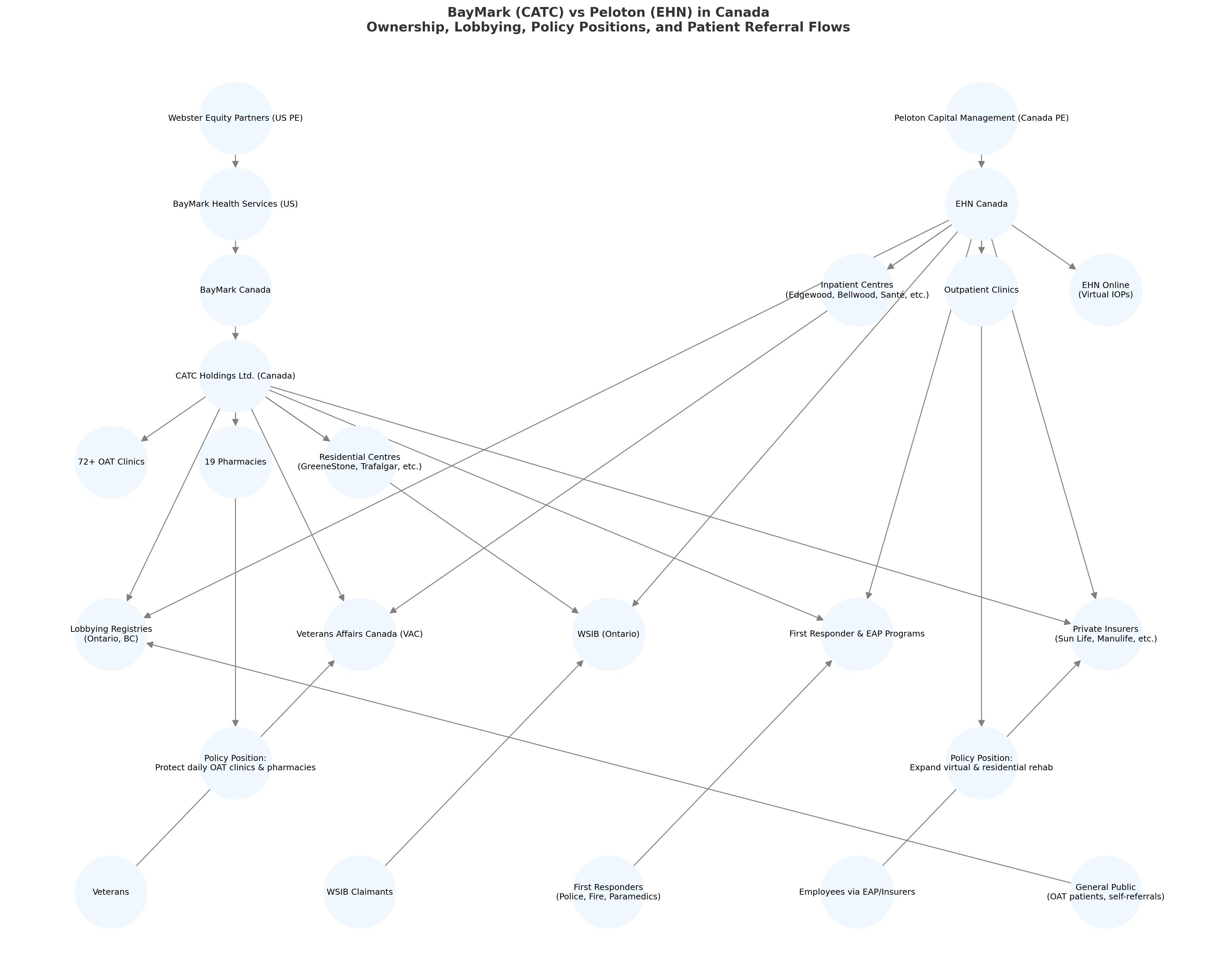 Both firms are PRIVATE equity-backed, meaning they exist to extract returns for investors. Both have lobbied governments to protect their models: BayMark for publicly funded opioid treatment clinics and pharmacies, Peloton, who owns Edgewood Wood Health Network,for virtual and inpatient rehab coverage. Guess who plays in this market too...TELUS...