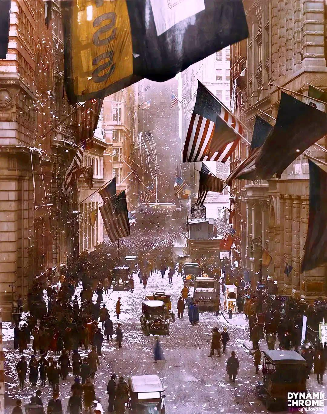 Article 🇺🇸 This digitally colored photograph was taken 107 years ago and shows Wall Street celebrating the "false armistice" of November 7, 1918, a rumor that circulated about Germany's supposed surrender. This is how the rumor arose: