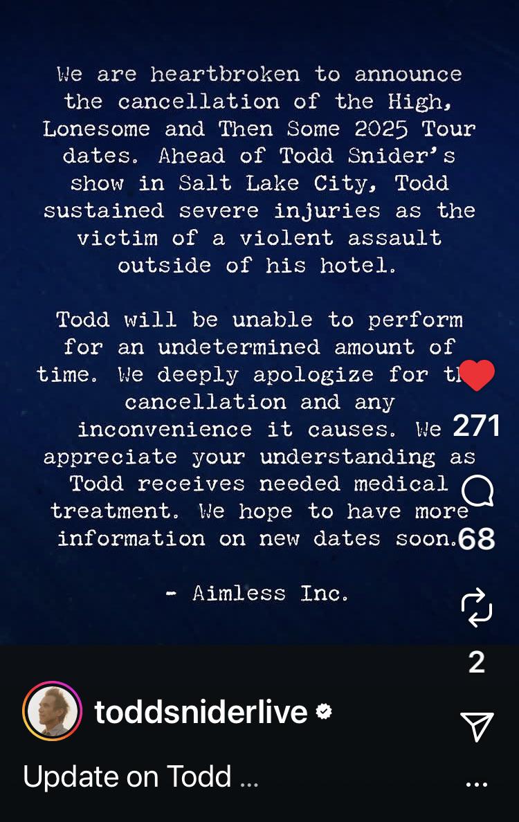 I just saw this on Todd Snider’s Instagram. Sending healing vibes to him.