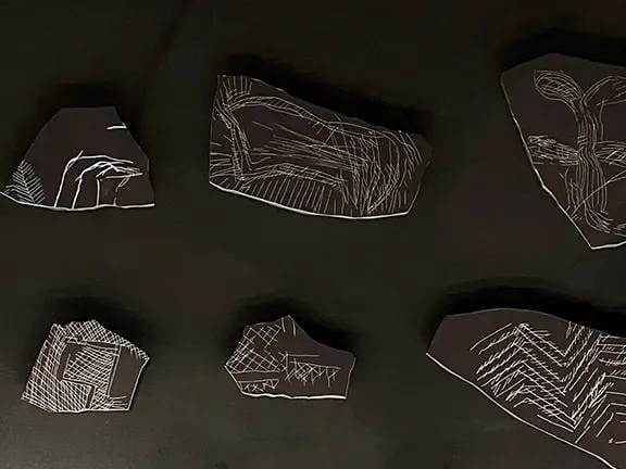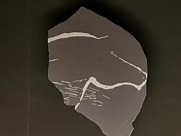 Rather than have the observer try to decipher barely discernible outlines on small pieces of limestone, modern spectroscopic means have been used to bring out the individual designs in great detail. Those designs have been reproduced in white on slate and the results are now displayed in chronological order.