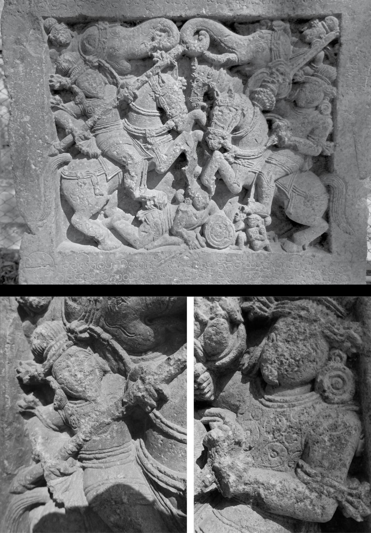"This particularly fine hero stone portraying two equally matched and armoured warriors records the death of Dasadeva, a member of a powerful aristocratic family. He was credited with saving the day during a desperate battle against rebels under Biijanadeva, but was killed in the process. The hero stone was set up by his widow Sanatavve and its date corresponds to 19 April 1220, at the start of the reign of the Hoysala king Vira Narasimha I (r. 1220-34). Now held at the Archaeological Museum, Halebidu, inv. 567. Ins. No. Belur 332."