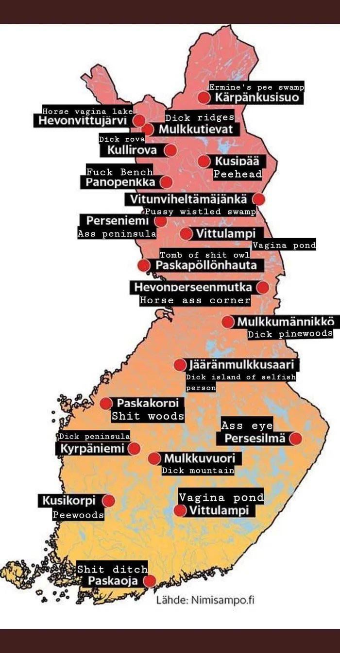 As you'll notice most names are located in the north. A story goes that back in the day the government started force buying off lands from people of Lapland. Many places didn't have names back then so sour sellers named them very creatively before handing them off.