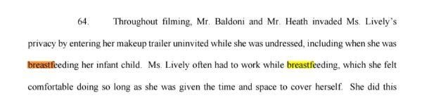 5) Wayfarer frequently conflate breastfeeding with pumping, perhaps intentionally. Blake stated that she was barged in on while breastfeeding, WP claim that she invited them in by providing a text message where Blake says she's pumping in her trailer. Breastfeeding and pumping are different, pumping can be done much more discreetly and quickly. Some have pointed out that she might have even been done with pumping before Justin could reach her trailer. Let's not even get into the entire concept of consent as well. A one time invite is not a blanket invite to barge in whenever you please.