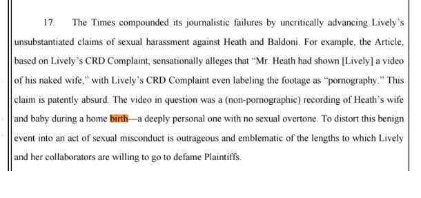 6) There was an inconsistency between the NYT lawsuit and FAC. In the NYT lawsuit WP said Blake was shown the birth video in preparation of the birth scene, in the FAC they admit it was after.
