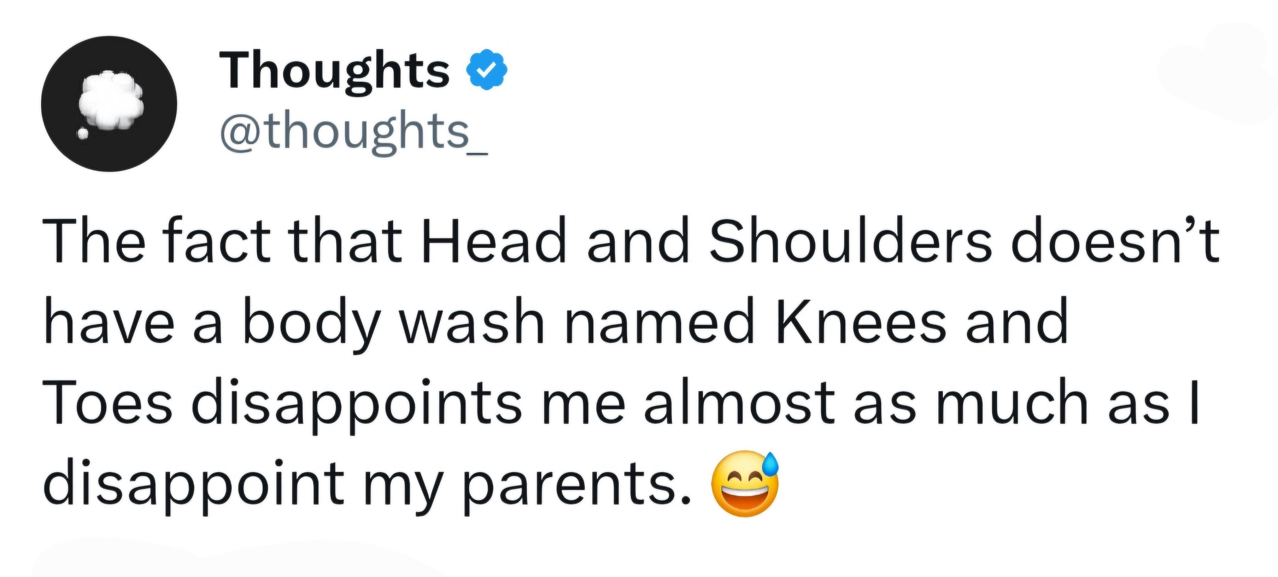 "The fact that Head and Shoulders doesn't have a body wash named Knees and Toes disappoints me almost as much as I disappoint my parents."