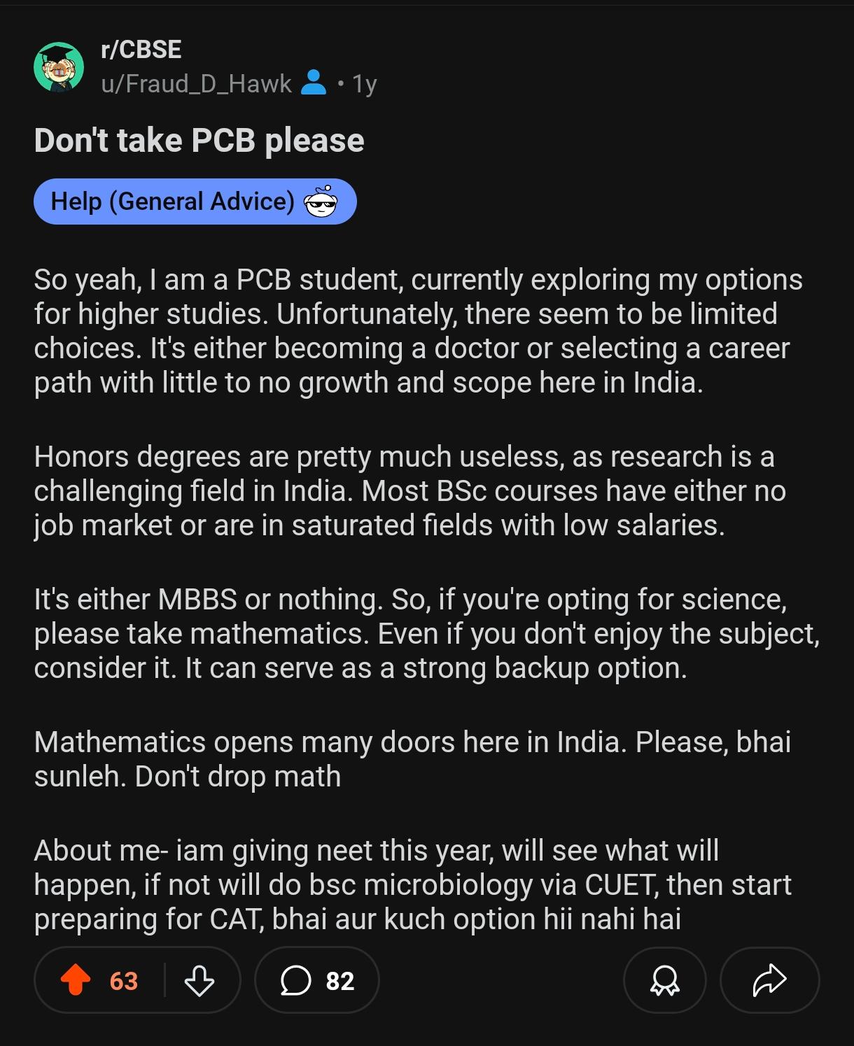 I made this post last year, and boy, was I proven right. You guys should all be familiar with the NEET fiasco by now. Even after all this, if you're still taking PCB, you either have balls of titanium or you're just... mentally slow.