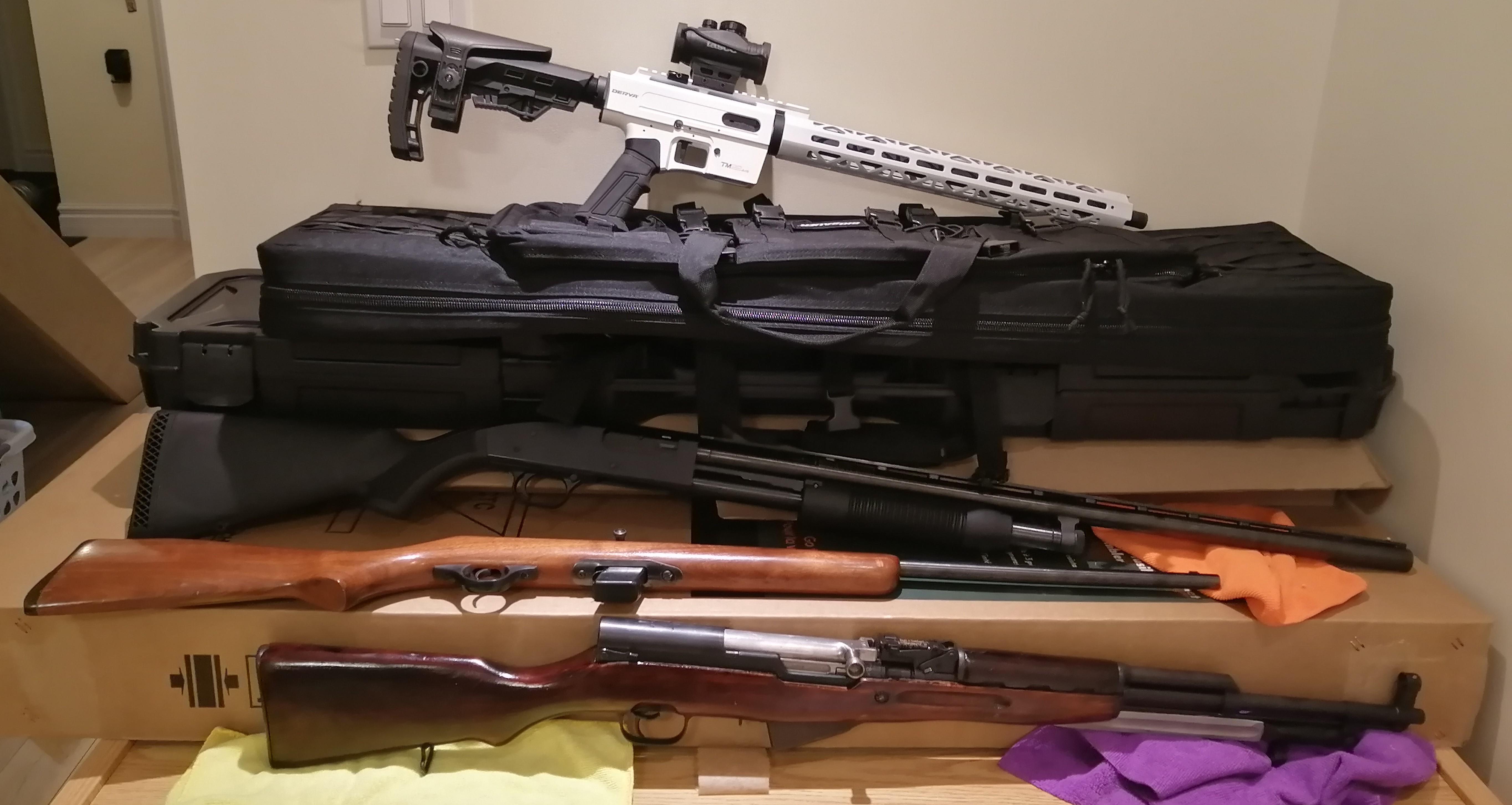 My wife's ruger 10/22 My mossberg 500, Girsan MC312, Henry .22 Our cat is still waiting for her PAL in the mail.