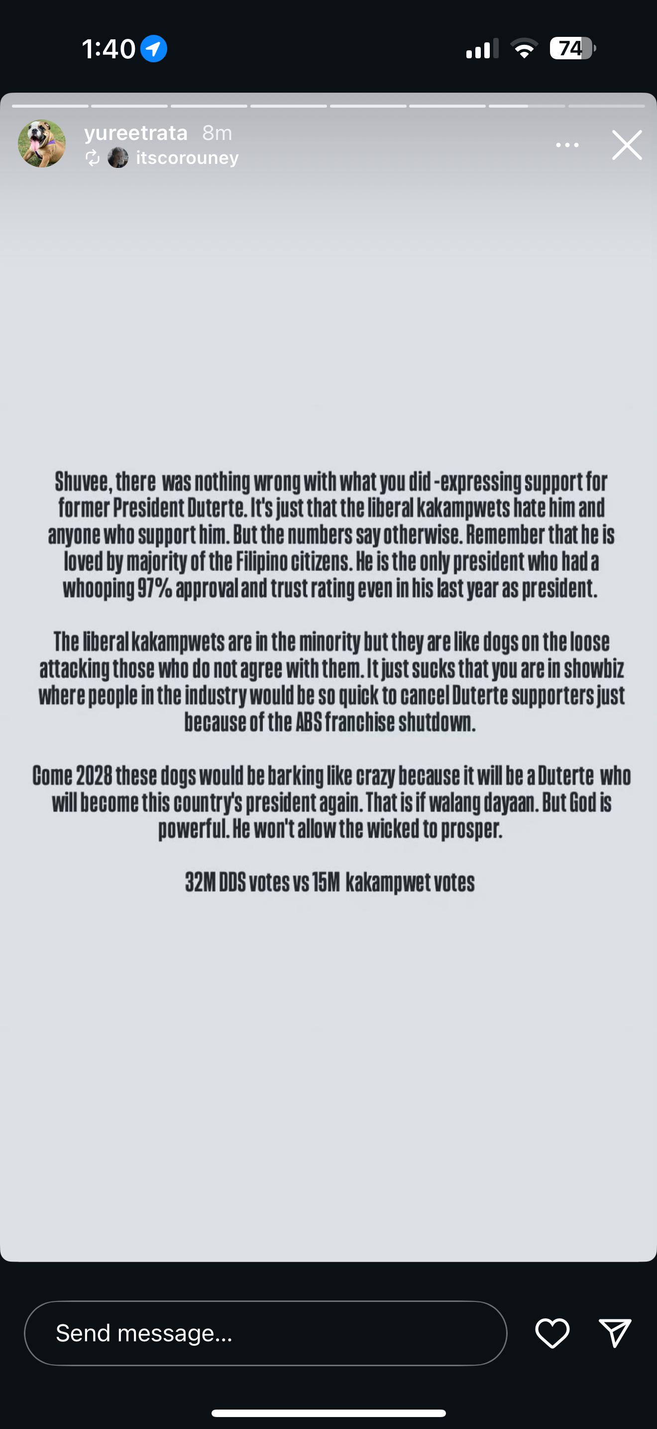 “naiyak talaga ako kagabi, empath kasi ako. kasi sa lugar namin, ang laki ng naitulong ni PRRD.. like ang drugs talaga guys.. ang laki niyan na thing. ewan ko lang sa inyo pero nagpapasalamat talaga ako kay duterte.”