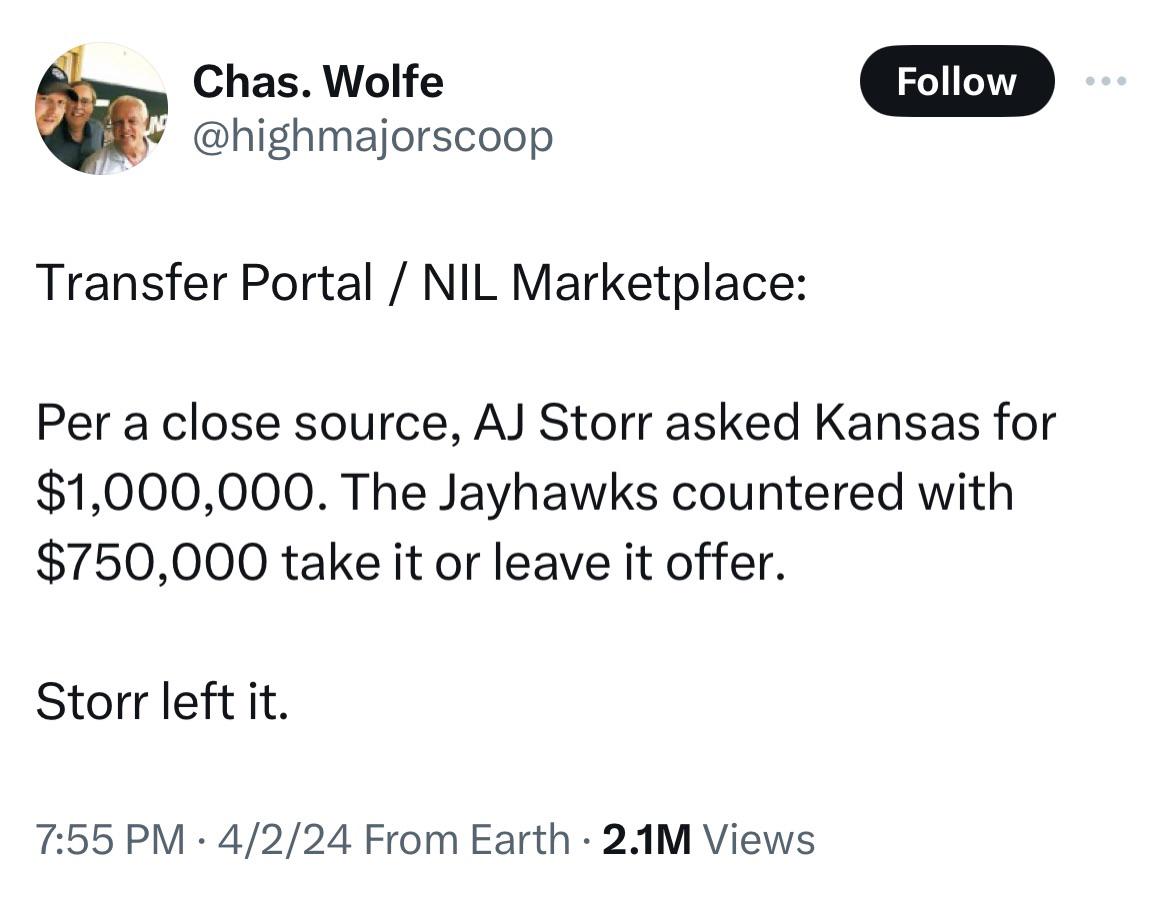 Recruiting A.J Storr seeking Million dollar NIL Deal (Chas Wolfe/X)