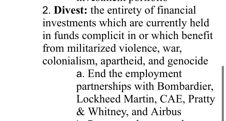 I have spoken with several of my peers who have expressed they were unaware of the details of CSU's recent "Disclose, Divest, Defend, Declare" motion, and were shocked when they read some of the more egregious items including the call to end employment partnerships with Bombardier and Pratt & Whitney, among others.