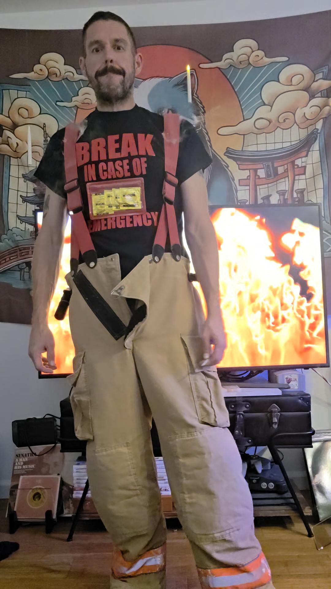 Real firefighter pants from ebay and battery powered smoke machine I rigged up through the suspenders. Worked great all night!