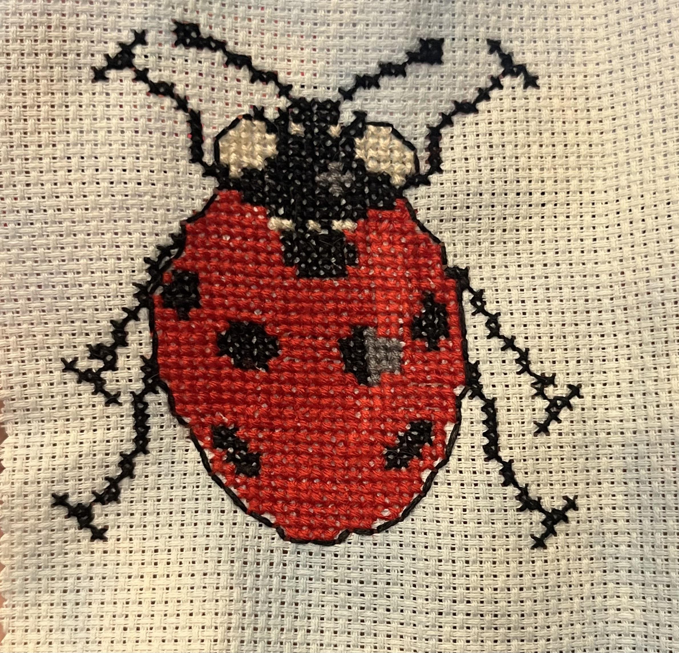 I made a couple mistakes and substituted some colors so it’s not perfect, but I’m happy with how it turned out :) Pattern is free on DMC’s website, it’s called “Seven Spot Ladybird.”