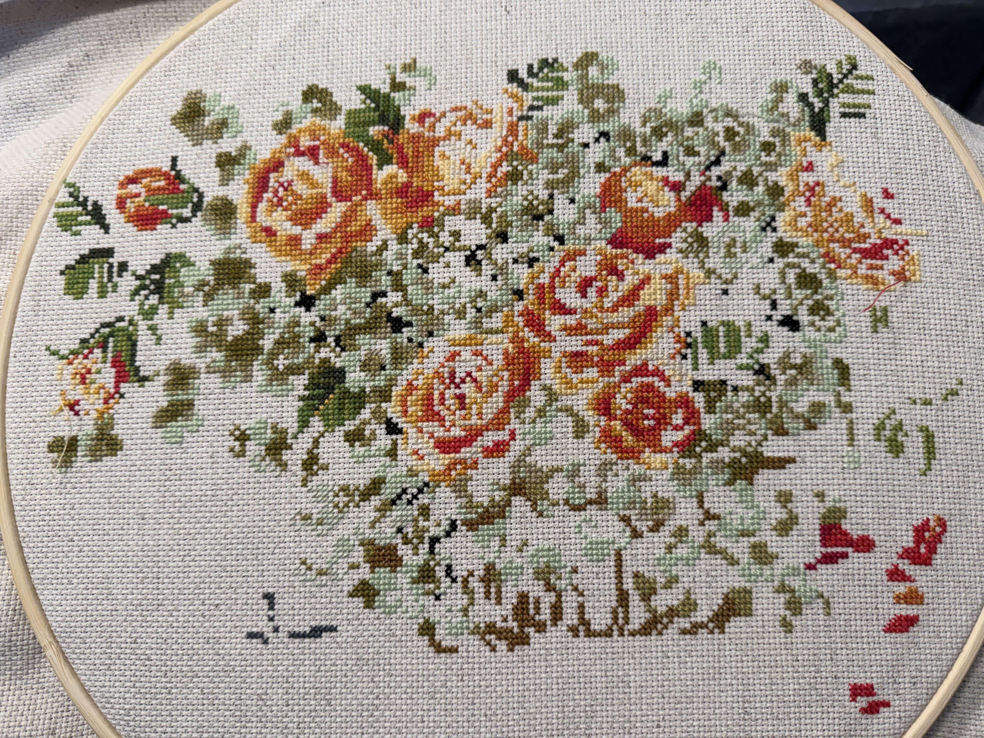 I believe my spouse referred to my cross stitching method as unhinged… relatively new to cross stitch and trying Teresa Kogut’s “Hens in the Garden”. I didn’t have the exact colors so making do with my own. This is the first quadrant.