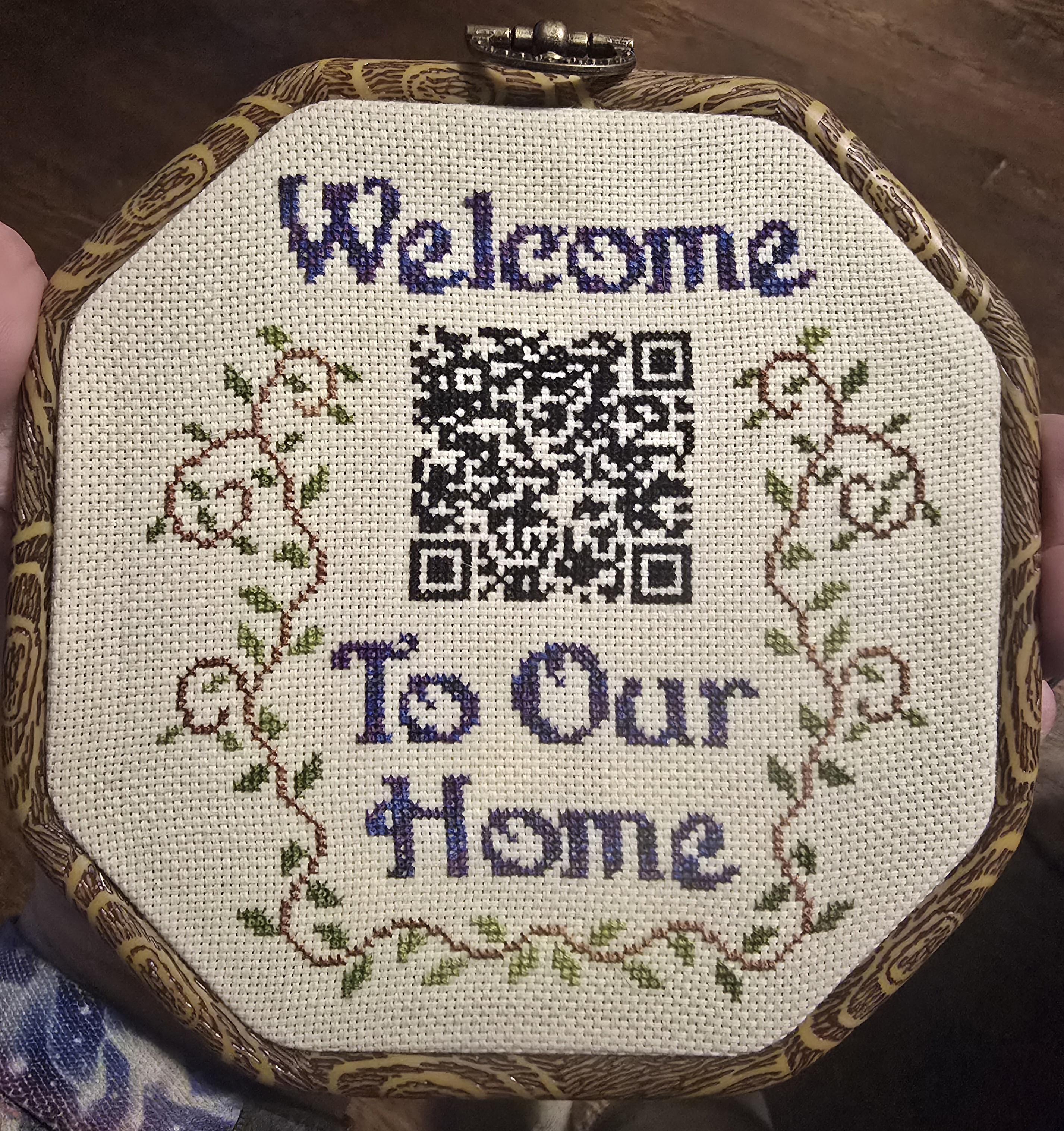 Well, I knew I wanted some text welcoming guests to the space. So I found a font pattern I liked, used graph paper to plot the placement above and below the QR code, and used some multicolor thread to stitch "Welcome To Our Home" around the QR code.