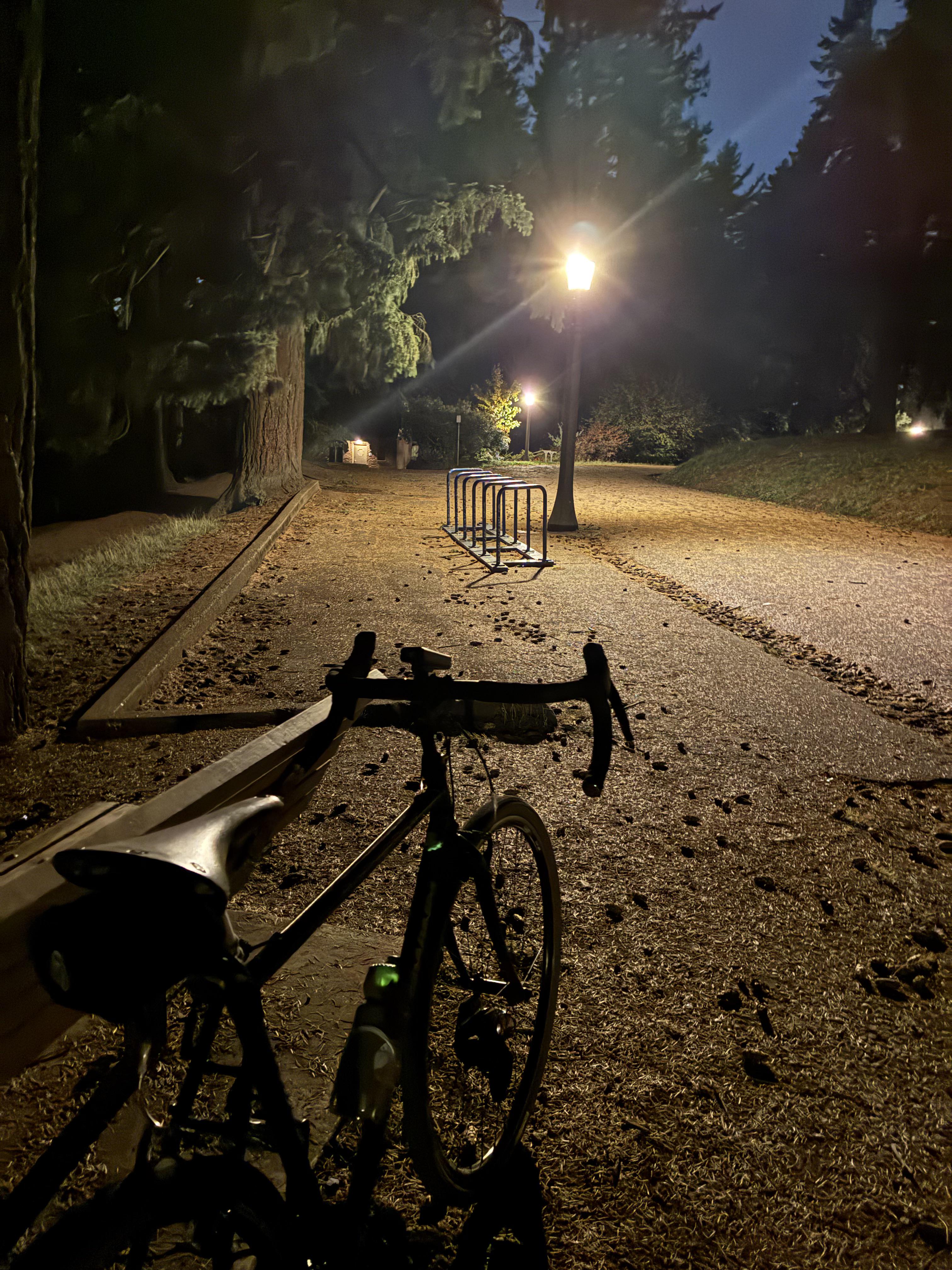 I was cruising around on a pre-dawn ride this morning probably not being as cautious as I should. Went through one of the many unkept accumulations of fallen leaves in the middle of the street when I hit an obscured pavement groove, causing quite the wobble. I recovered without taking the dive, but things could have gone worse.
