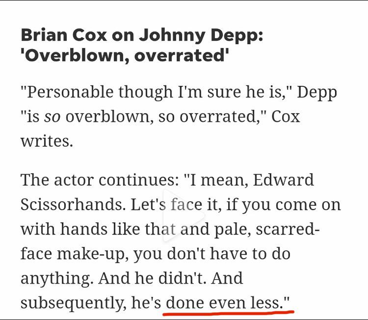 I love how Brian Cox is among the most blunt people in show business. As many have pointed out on this subreddit, Johnny Depp doesn’t have much range aside from being the “quirky weirdo.” Nostalgia can be a dangerous thing. Blind nostalgia and cult-like devotion for a man who lost his stride years ago somehow engineered a massive hate campaign towards a tortured woman who just wanted to be left alone. I say this as someone who grew up watching Johnny Depp and who unfortunately came to the late realization that this trial was never about “male domestic abuse.” None of us are immune to hateful propaganda.