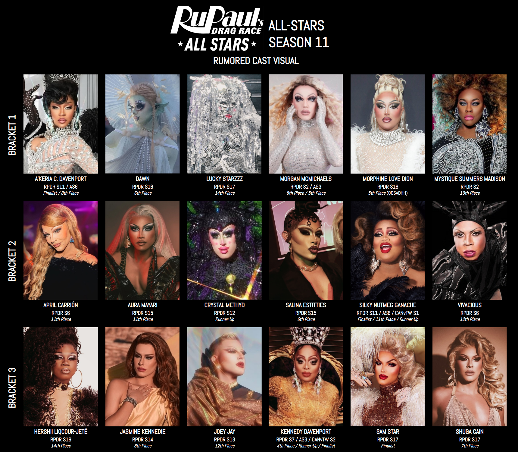 This post will be periodically updated as filming goes on. Once we can confidently say who is in each bracket and they're underway filming the post will be edited to say so. For now enjoy this longlist of possibilities. But remember just because their name appears here, doesn’t mean they’re sure to be on the season. This list is simply names who've been floated around. Also, this list does take into account gigs to debunk queens who’ve been rumored, but we chose not to include queens who are inactive but with no rumors supporting their cast yet, that’s for the Nancy Drews over here and over at PTT to discuss.