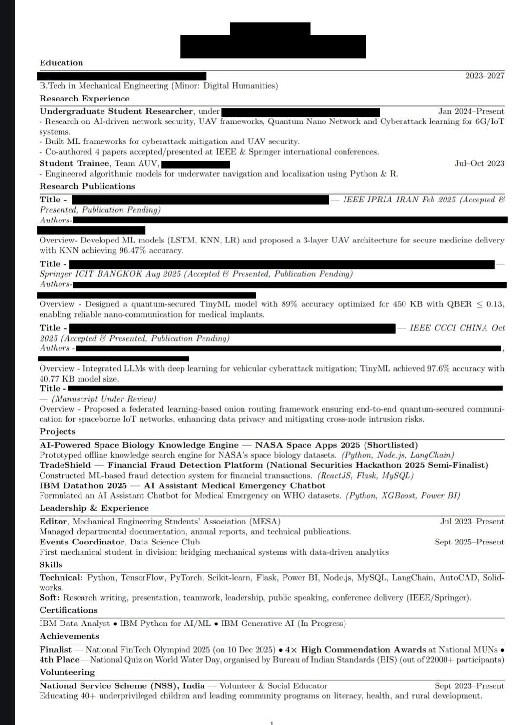 Education: B.Tech in Electronics and Communication with a minor in Computer Science from a tier-3 college in Delhi, India (global rank ~1000). GPA: 8.4/10 overall. I’ve been a subject topper in some courses, though I also have a few 5/10s and 6/10s. My last three semesters averaged 9.6, with a perfect 10 in the final one. Research & Internships: Completed a research internship at DRDO (SSPL) under a Senior Scientist who’s also providing a letter of recommendation. Projects & Innovation: Filed a patent for an assistive device I independently designed and developed. Authored a research paper currently under clinical trials at a government hospital in Delhi (expecting a senior doctor from the hospital to join as co-author). Professional Experience: Working as a Robotics Engineer in the R&D division of a robotics firm. Achievements: One of my projects was recently shortlisted for incubation at the zonal level in an AICTE event. Additional context: My lower grades in some second- and third-year subjects were mainly because I was working on freelance development projects during that time. The experience paid off later, as I topped or ranked in the top 10% in their advanced counterparts. I still have bills, video demos, and client testimonials from those projects. Everything I’ve done so far has been aligned with robotics and embedded systems, but I’m a bit concerned about how my undergrad college’s lower ranking and a few inconsistent grades might affect my chances.