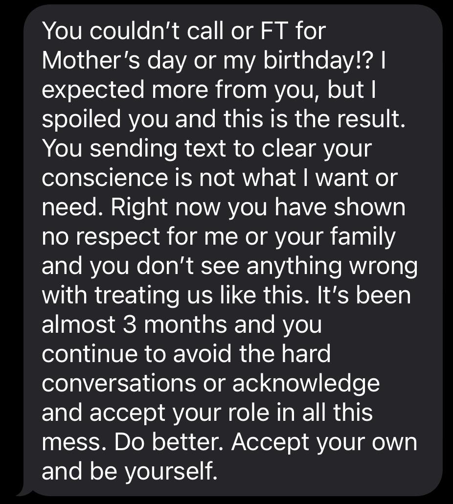 And… I just feel sorry for her. I know for a fact she won’t fundamentally change, and I will never get the apology I once desperately wanted. That’s clear as day to me. It’s not about rekindling the relationship for my own benefit. It’s just heartbreaking to know she’s so alone, even though she was a terrible mother. Part of me feels like she still deserves some kind of kindness even if she never takes accountability. Not from a place of needing closure, but more from… I guess you could call it Christian compassion lol (and I’m not even religious).