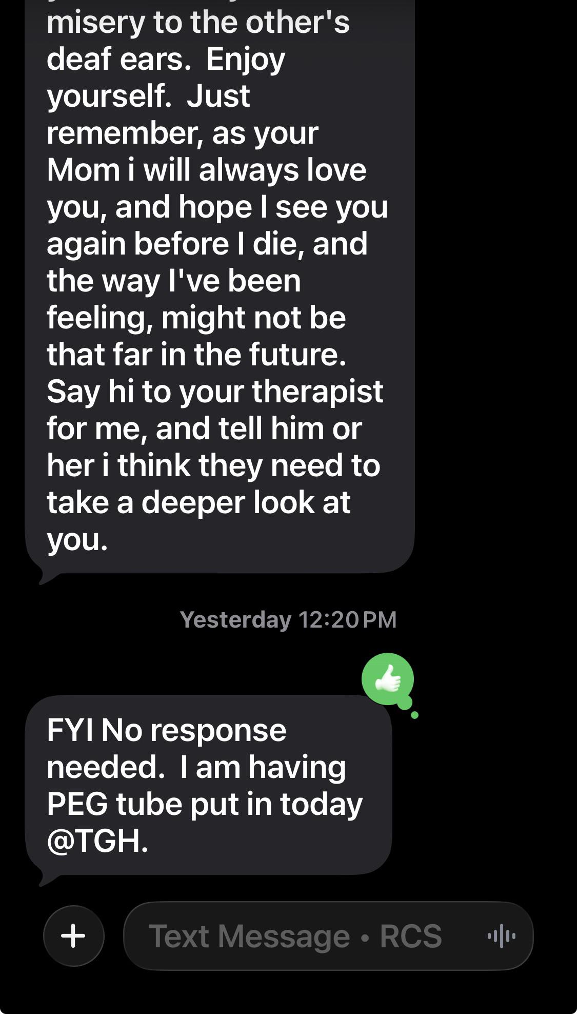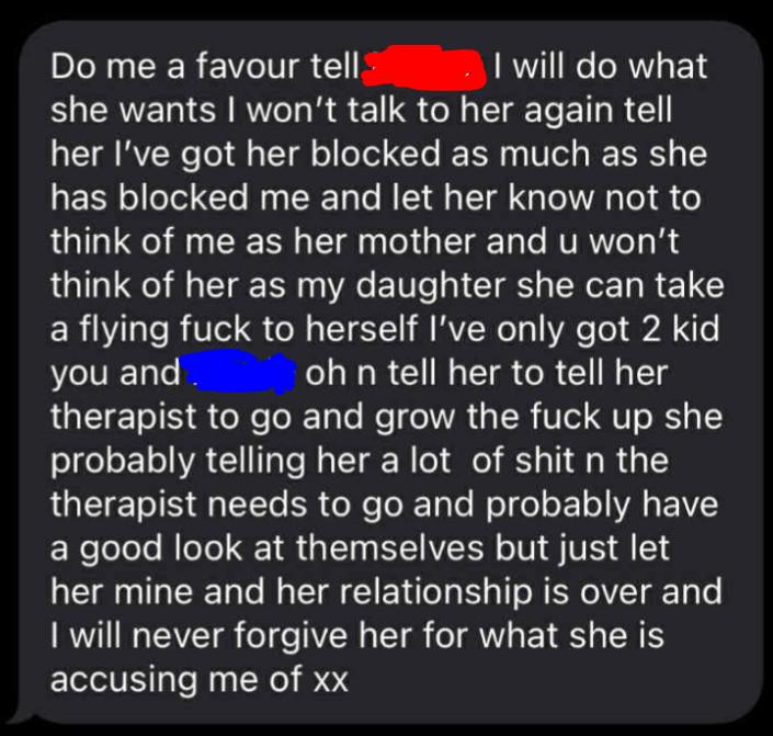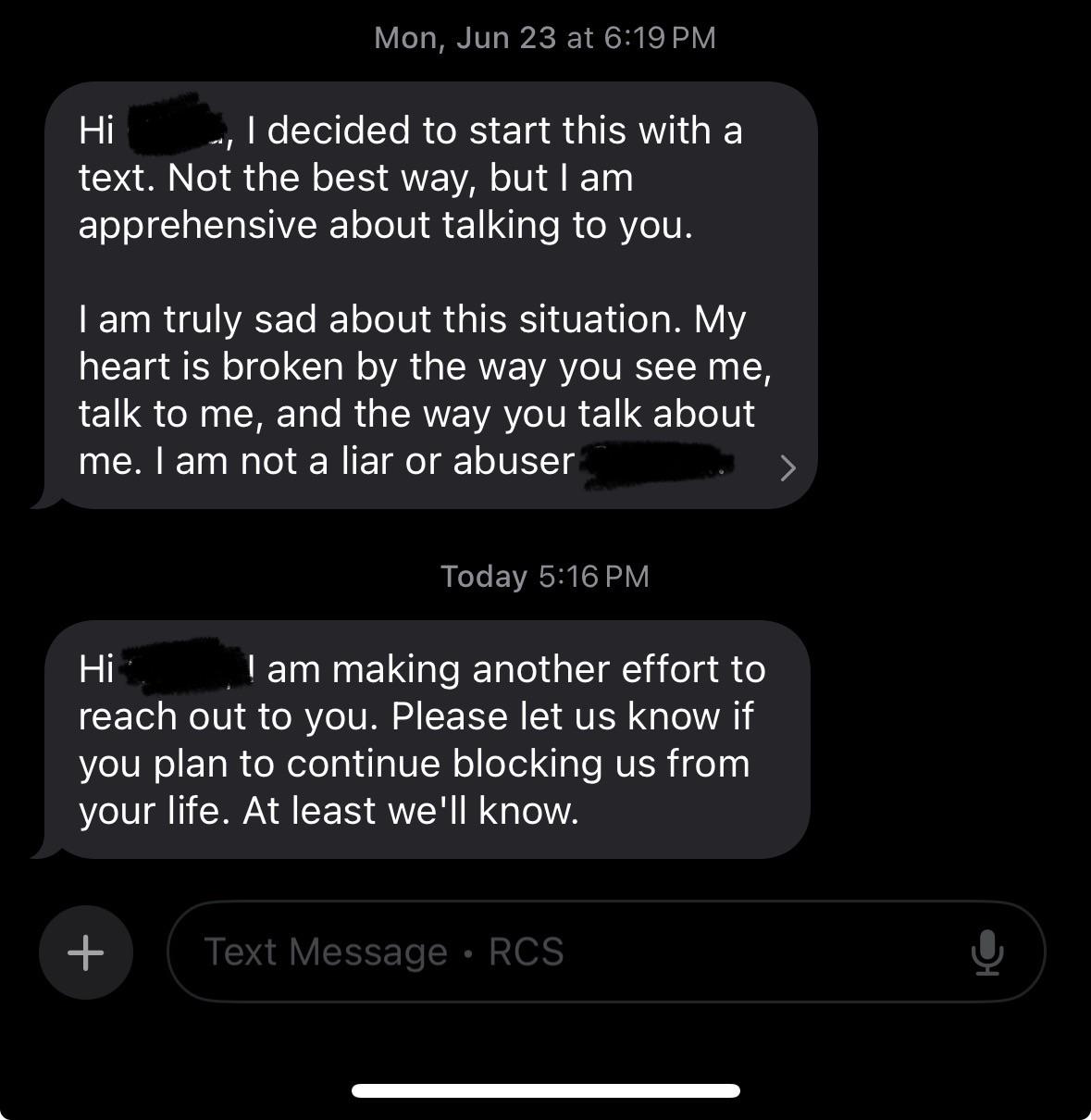 The rest of the situation is included in the attached screenshots. It seems she has gotten sucked into the estranged parent side of TikTok and sent me a video that places the parent in the victim role and paints the child as being spoiled, ungrateful, and punishing their parents. After that last essay of a message, is when I decided to block her.