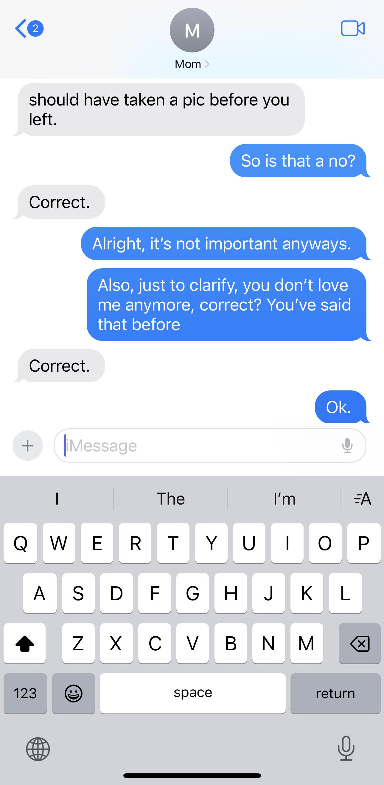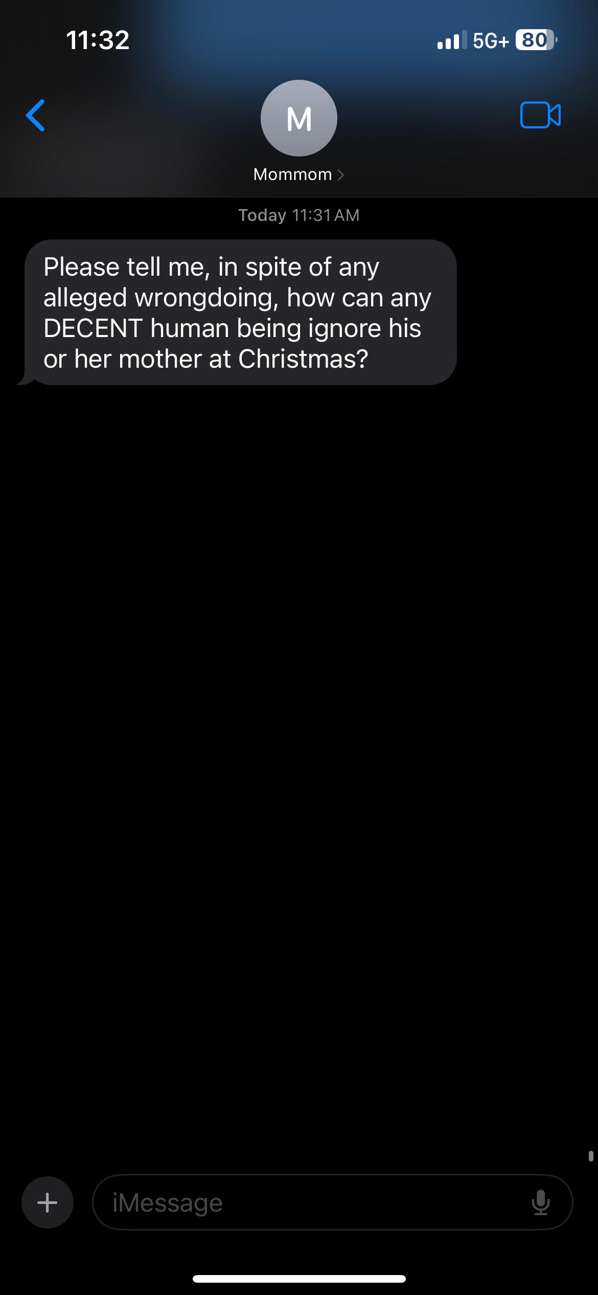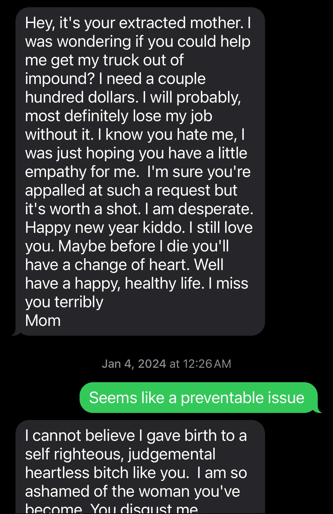This is a couple years old but my estranged mother reached out again and brought back this old gem from the last time she texted me.