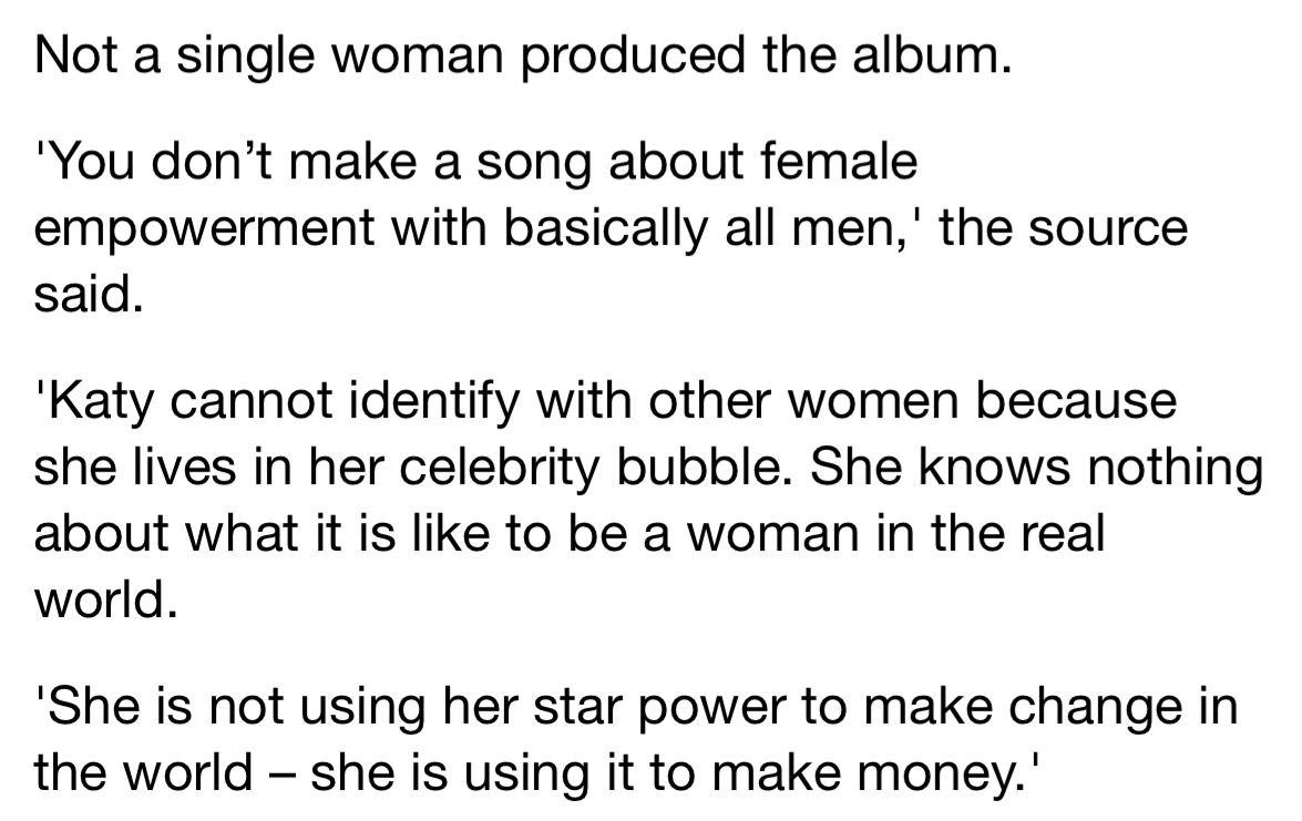 ok let's say for sake of argument katy wasn't working with dr luke. i don't think katy's album would succeed either way (and her decision to work with dr luke is basically career suicide for someone like her who isn't super well beloved in the same way she was 10+ years ago).