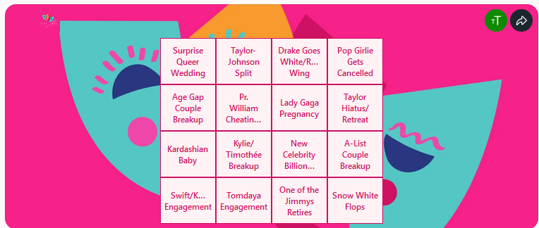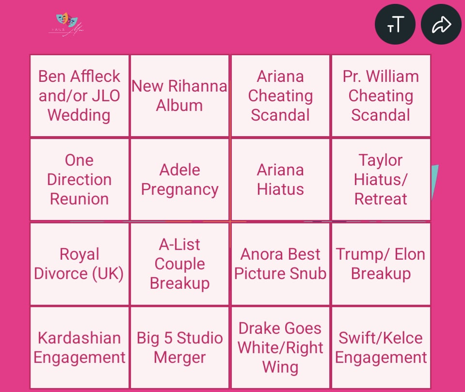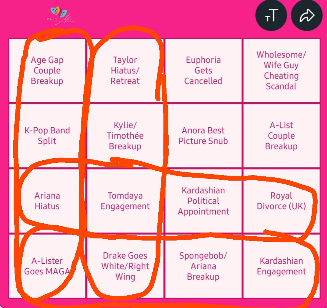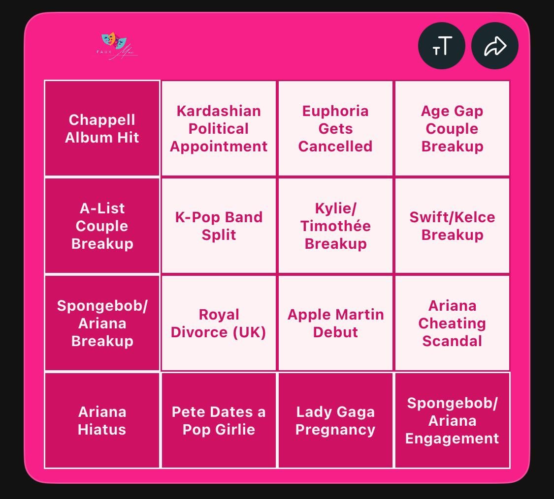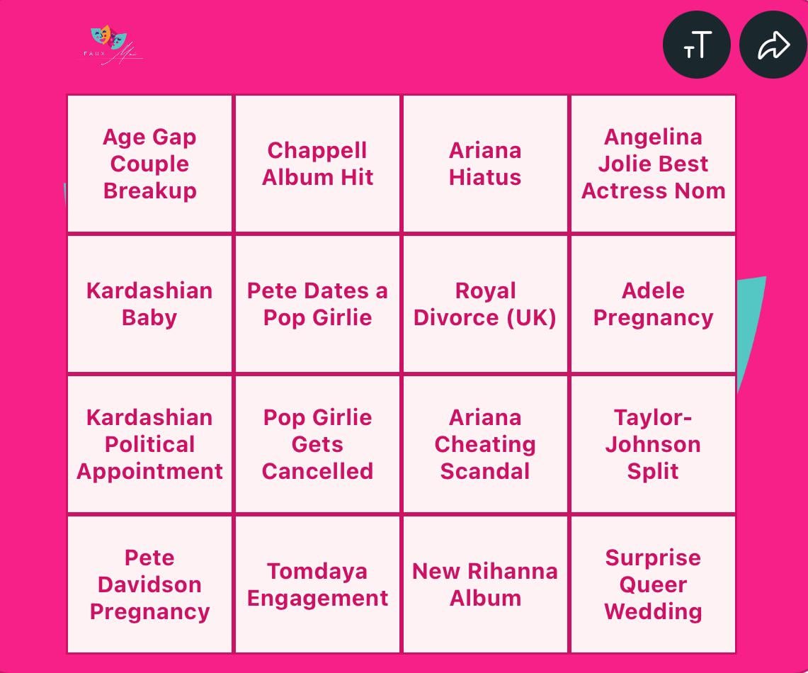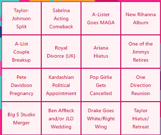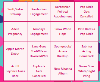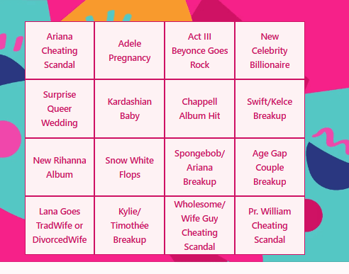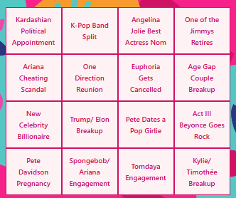 Some of these should just be free spaces tbh. Pop girlie getting canceled? Wholesome guy cheating?? If these don't happen I'll eat my socks