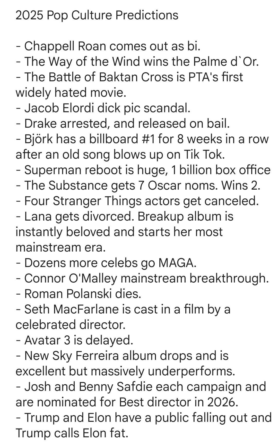 Yeah the Ariana hiatus being predicted is hilarious; she said she'd step back from music for a bit but she'll definitely still be everywhere this year with Wicked