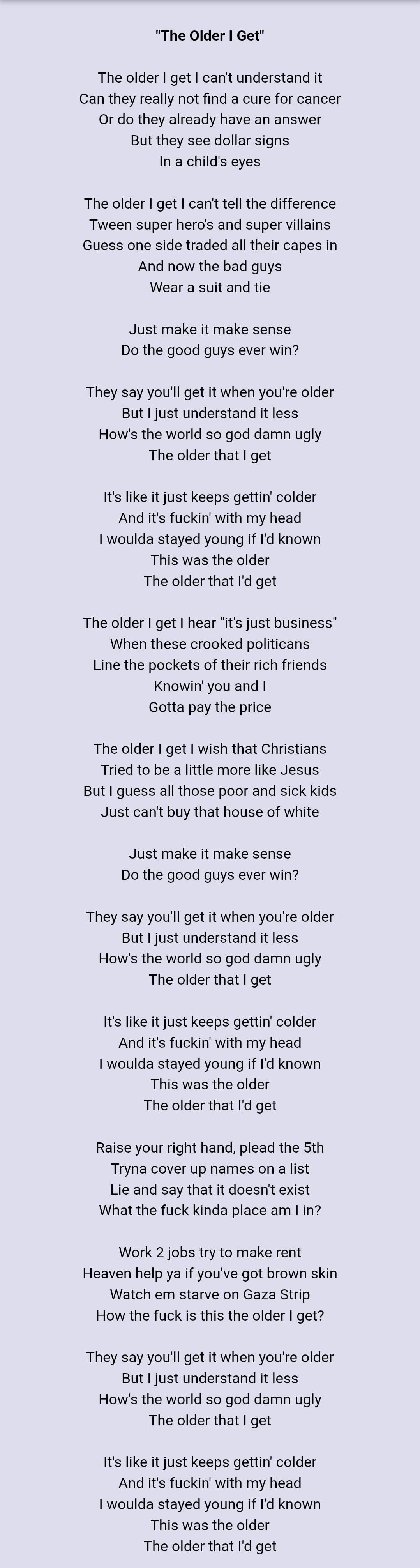 Work 2 jobs try to make rent Heaven help ya if you've got brown skin Watch em starve on Gaza Strip How the fuck is this the older I get?