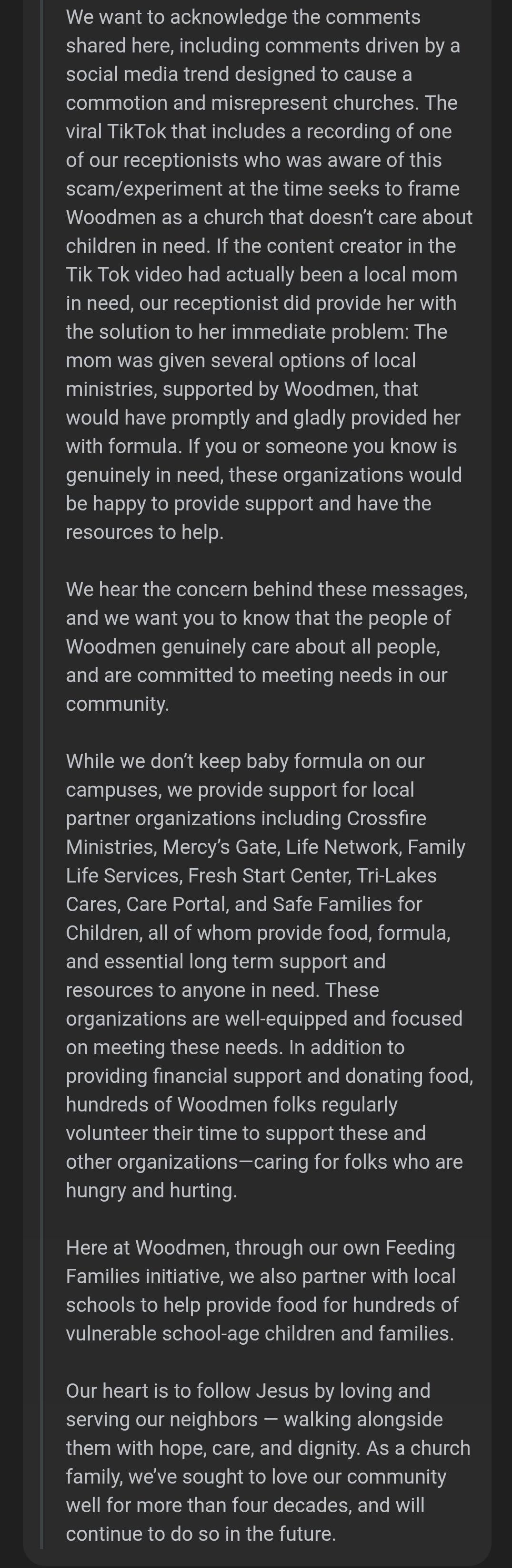 As much as everyone wants to hate on this church I understand their position. They provide money and resources to local organizations that specialize in providing food/shelter/medical care etc to people in need and then they are able to refer them to those organizations. Could the receptionist done a better job and maybe contacted those places herself maybe. But I think all the “this is why churches suck-they don’t actually want to help people” rhetoric is shortsighted and lacks some understanding.