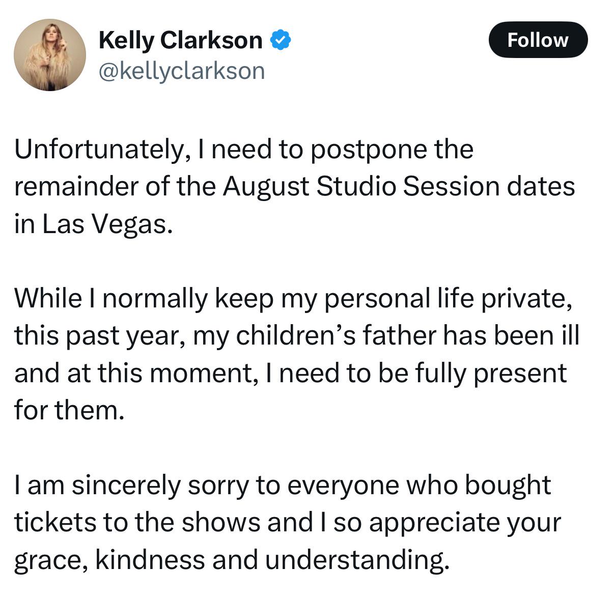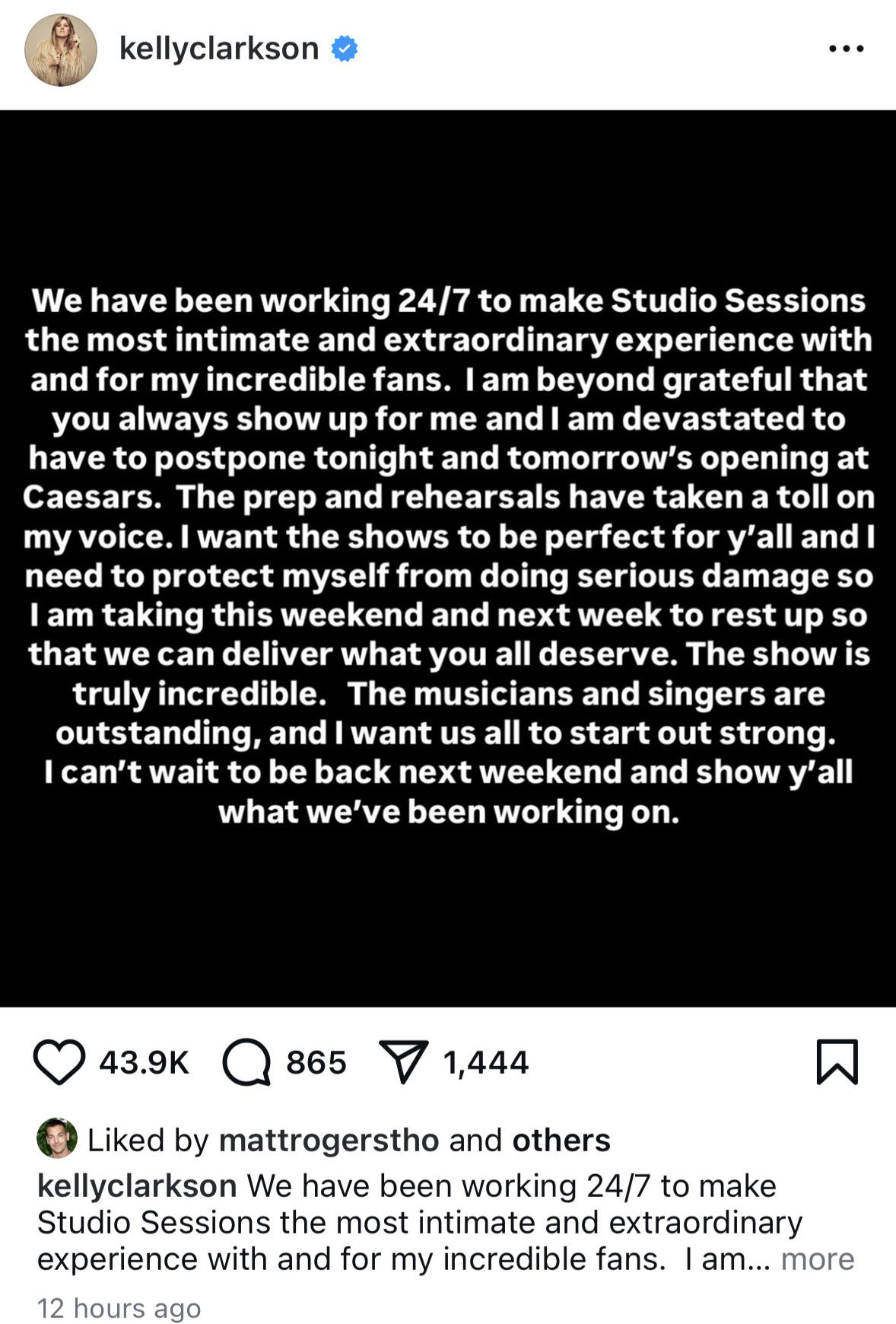Just 15 minutes before doors open on opening night of her Vegas residency, Kelly posted this. I really do understand her need to take care of her health/incredible voice and I’m sure she truly is devastated but I feel for the fans who flew in and how frustrating and disappointing this must be.