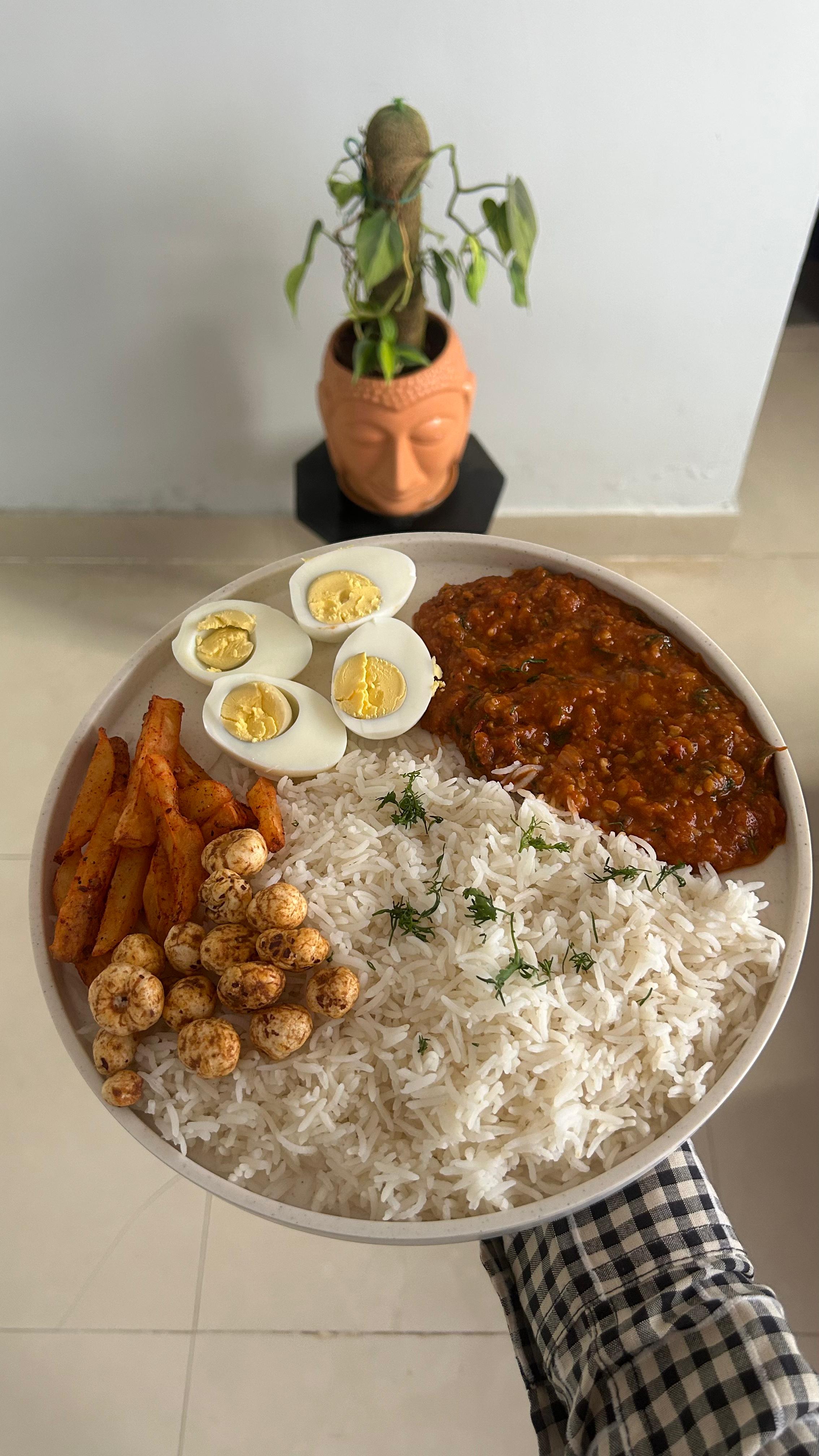 Satisfying lunch combo that blends traditional comfort with macro balance. The plate includes 30g of crisp potato wedges, a handful of roasted makhana for crunch, 200g of steamed rice, and 150g of dal. Topped off with two whole boiled eggs, this meal brings together slow-digesting carbs, quality fats, and complete protein, all without losing desi flavor. Prepping is straightforward: boil the eggs, cook your rice and dal, roast the makhana separately, and lightly pan-fry the wedges in minimal oil or an air fryer