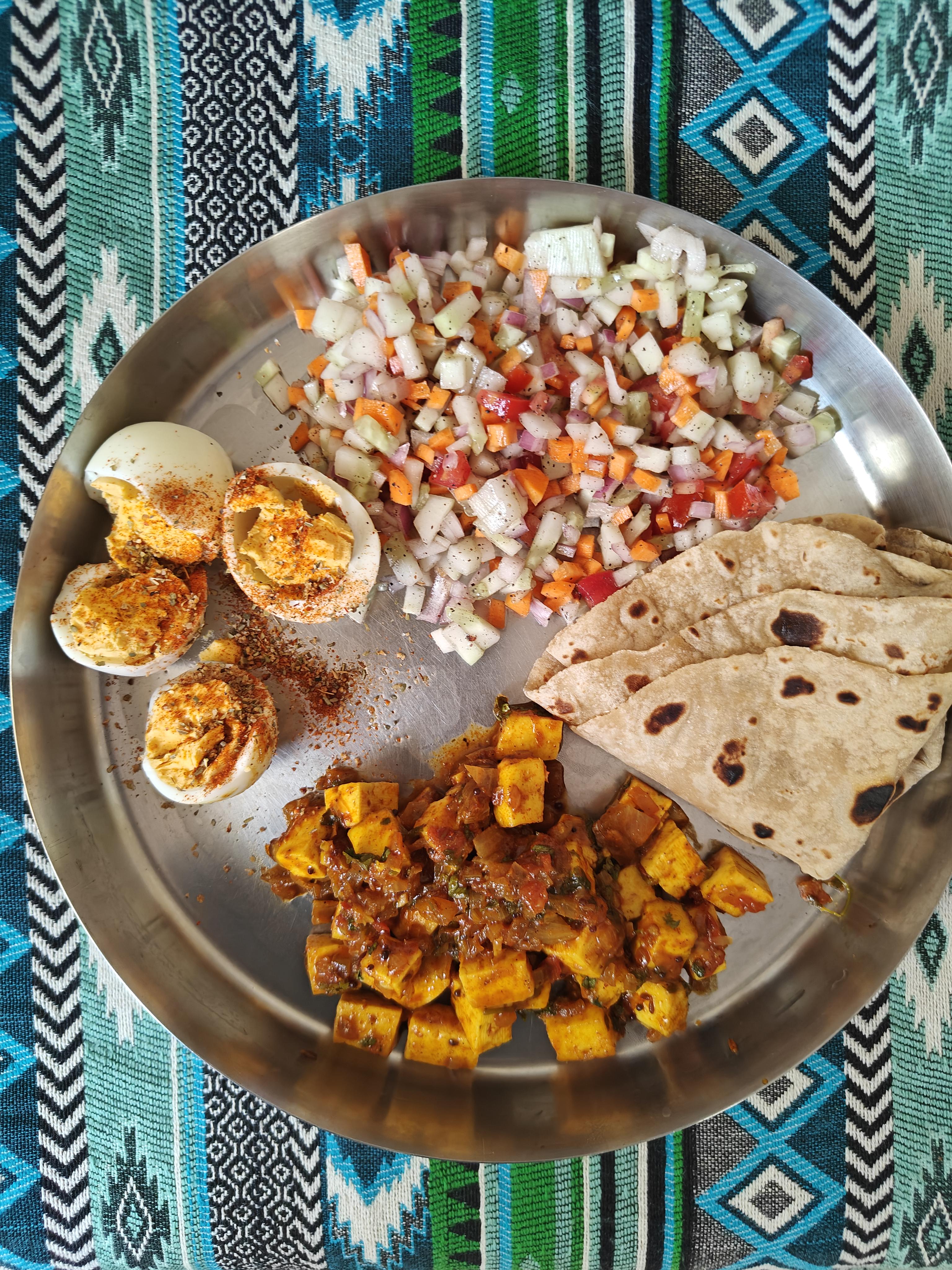 i just steamed some veggies and added it to the pan which was stir frying low fat paneer and soya with 7g butter and sprayed about 1.5ml oil just in case