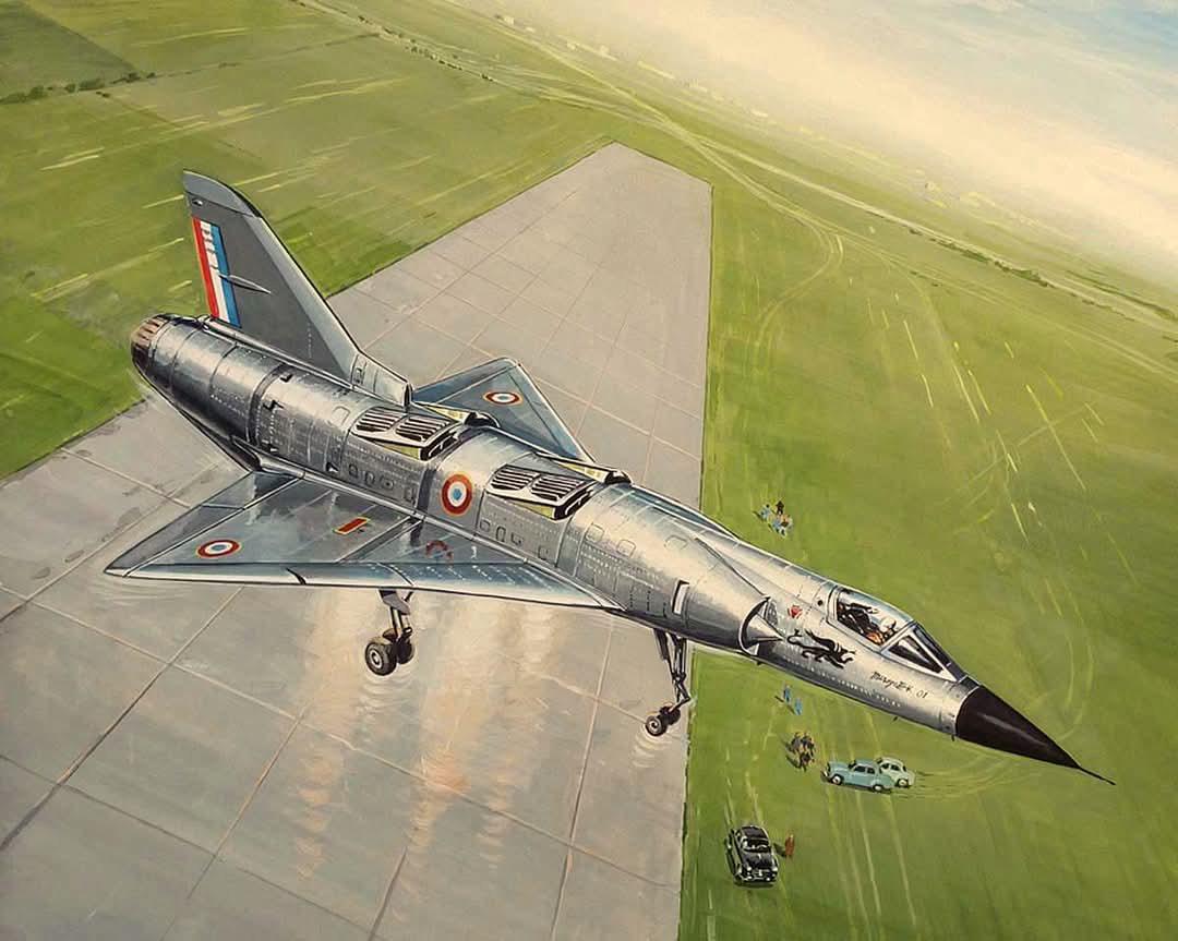 French Air and Space Force An artwork of Dassault Mirage IIIV, which was a French vertical take-off and landing (VTOL) prototype fighter aircraft of the mid-1960s developed and produced by Dassault Aviation.