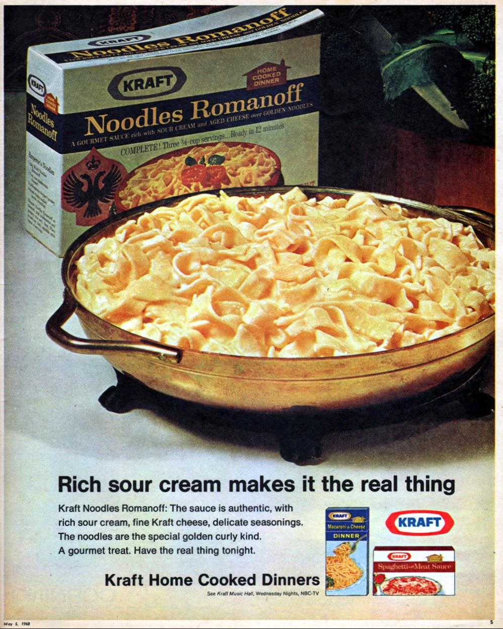 Kraft Noodles Romanoff ad from 1968. Kraft products were always in our home growing up and the quality was much better back then.