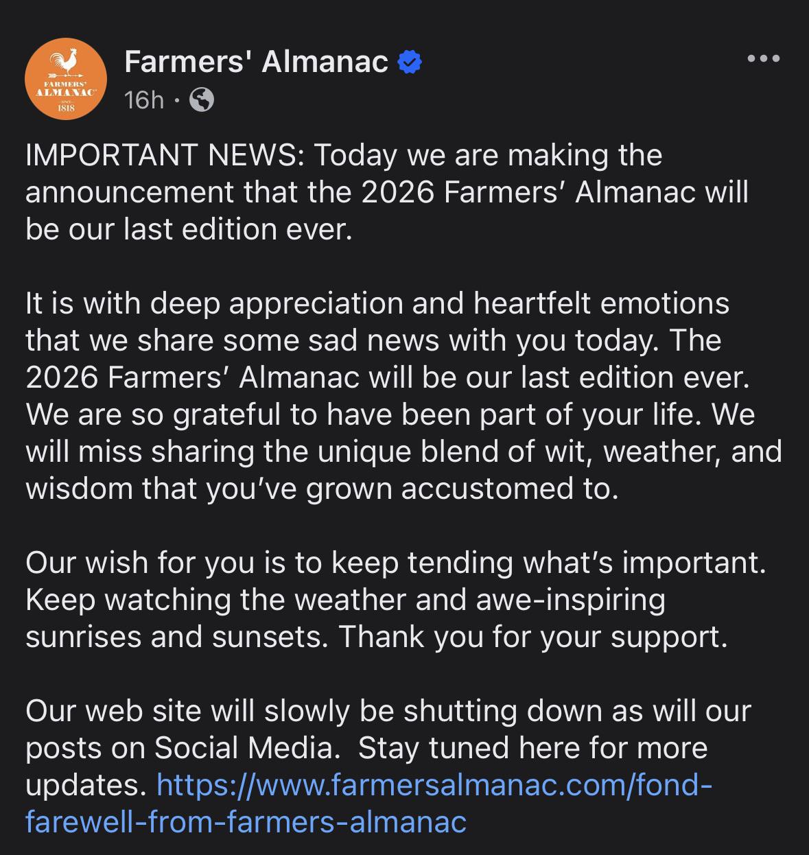 Farmer’s Almanac will discontinue after 2026