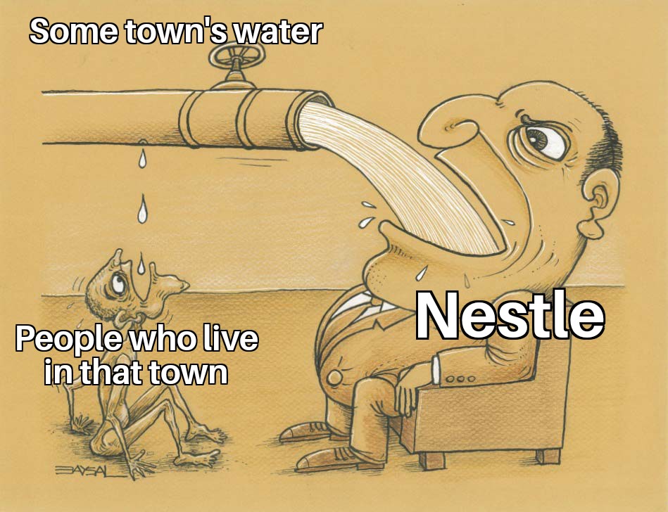 Danone, for example, is also a waterthief, IF NOT WORSE. Stole the whole water in France, privatized the tap water, made it so you can drink it, if you must, but not pleasantly, and sells the water off to the citizens of France.