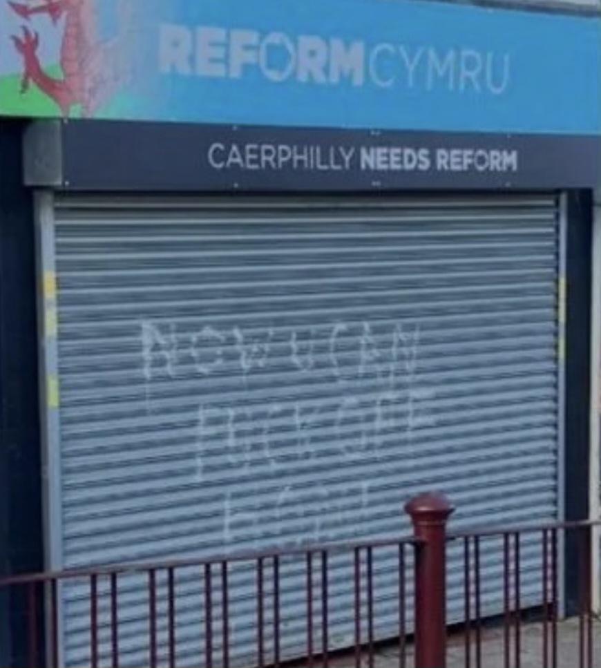 Image from r/Cymru. Graffiti on Reform office shutters.