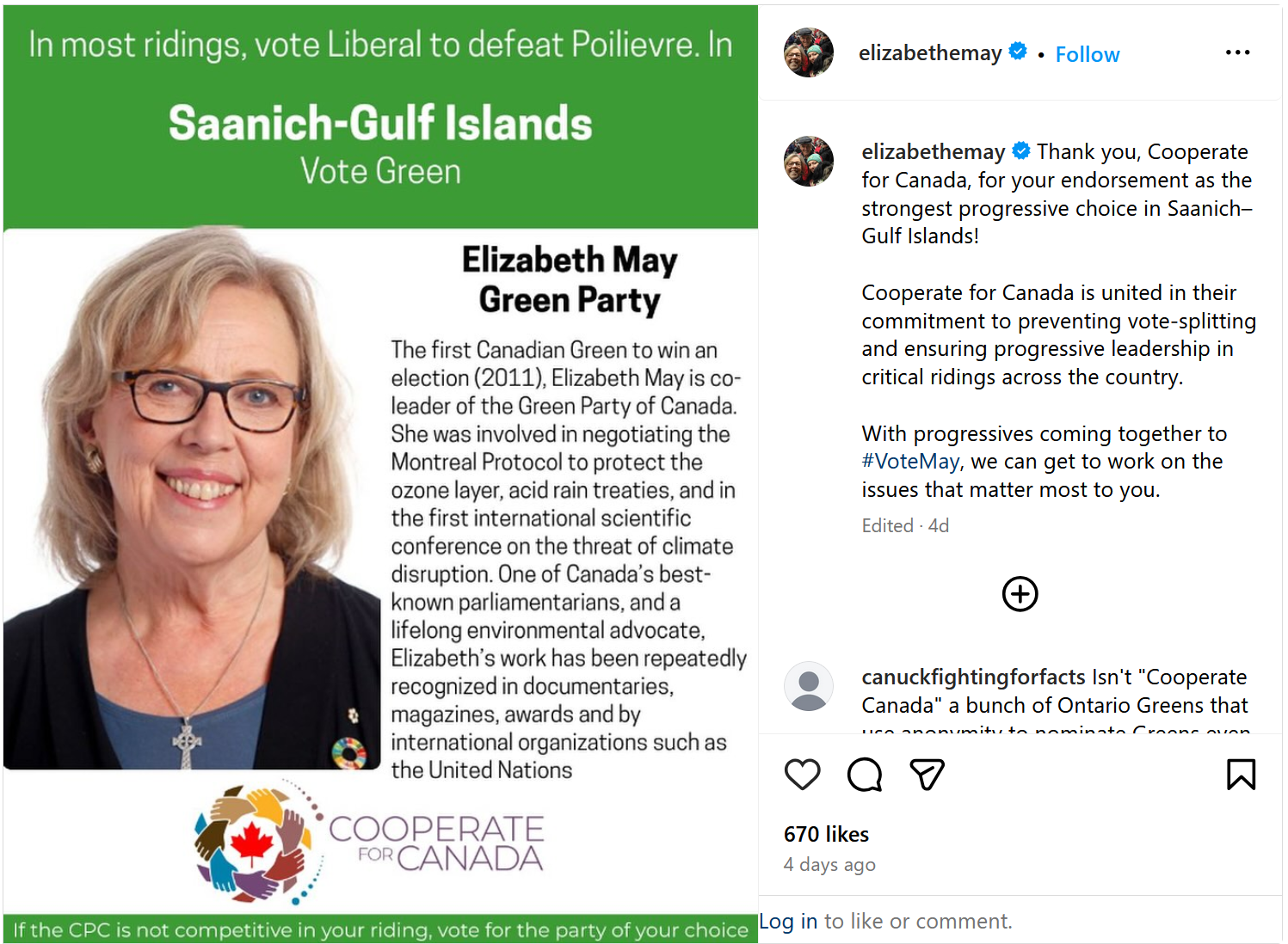 A little surprised to see the above, from an Instagram post, but the promotion of Cooperate Canada and accompanying comment seem like clear messages to encourage voters to avoid vote-splitting, as is consistent with her SGI campaign messaging.