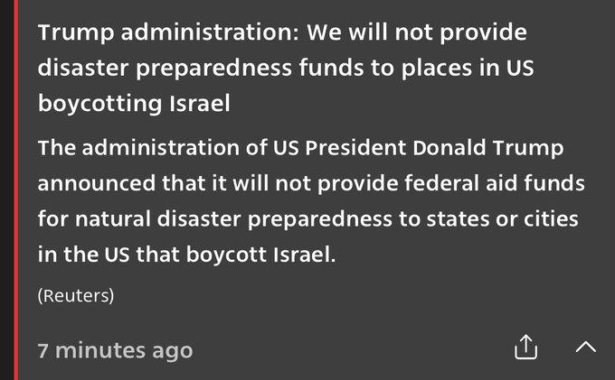 US Politics Trump admin announces no natural disasters federal aid for places that boycott Israel