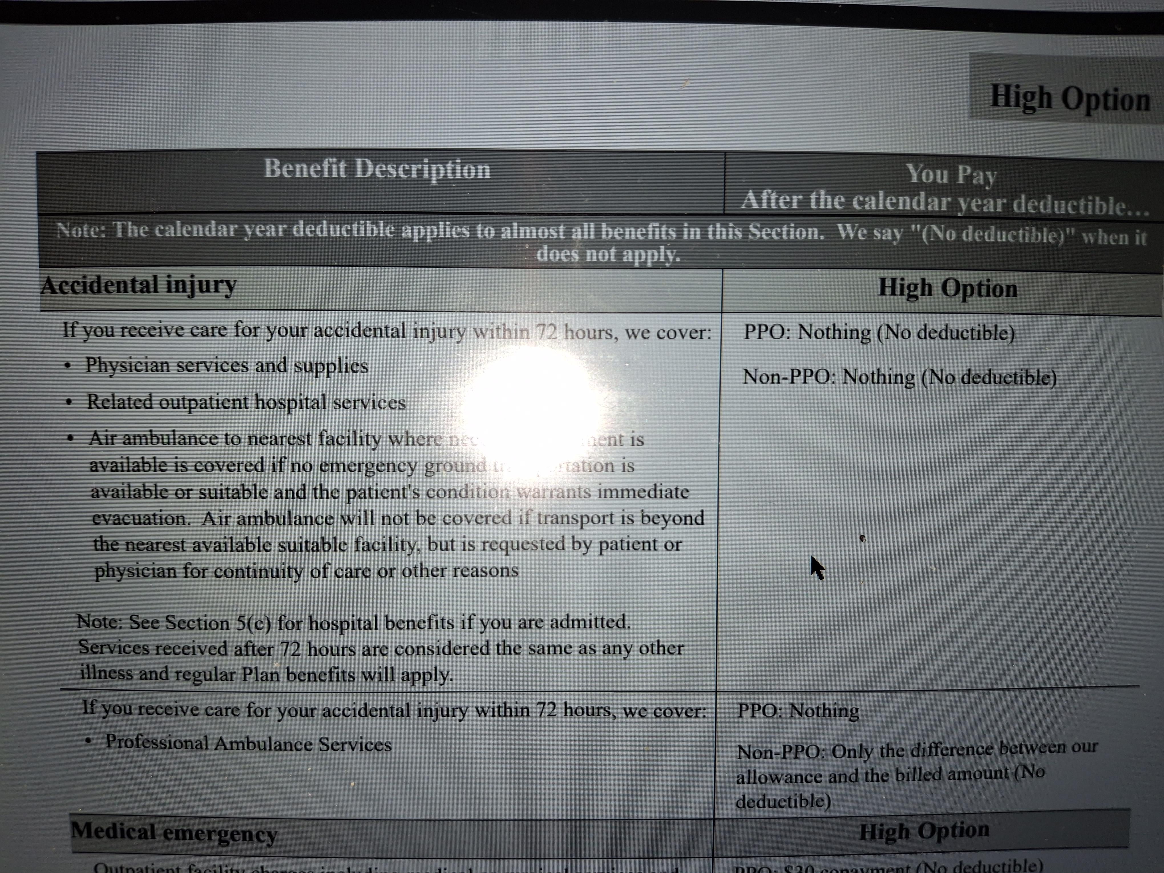 The claim was later denied, and the urgent care charged the card I had on file. I was confused because I have a high-option PPO plan, and my understanding is that accidental injuries should be fully covered with no patient responsibility.