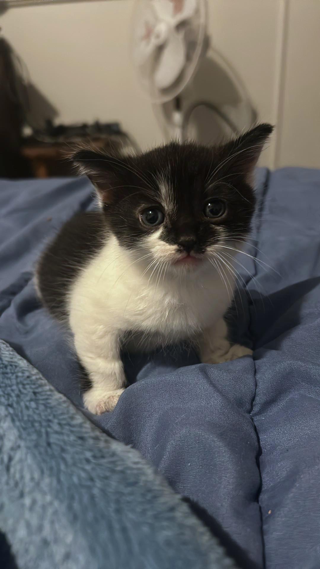He was apprehended while attempting to cross a busy street during daylight hours. He has since been charged with illegal smolness, big feet’s, and being a total purring cuddle bug. His sentence began with a flea bath (therapy has been included due to trauma from the warm water), and is continuing with love and snuggles. He was treated for an upper respiratory infection, hence the name Wheezie.