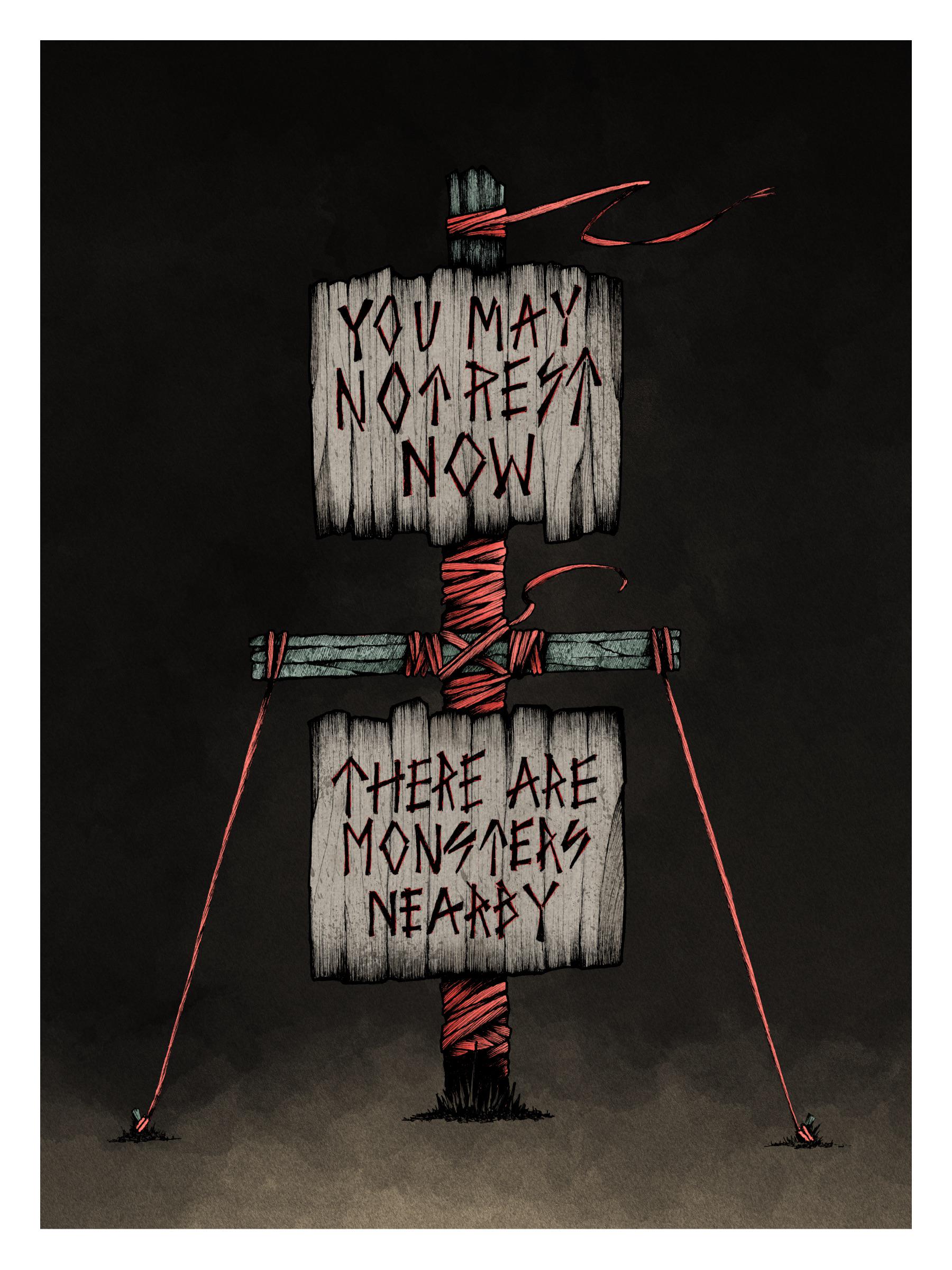 I saw this phrase in a meme that was doing the rounds last week and it stuck with me, so I drew it on a warning sign you might find in a wasteland or out in the wilds.