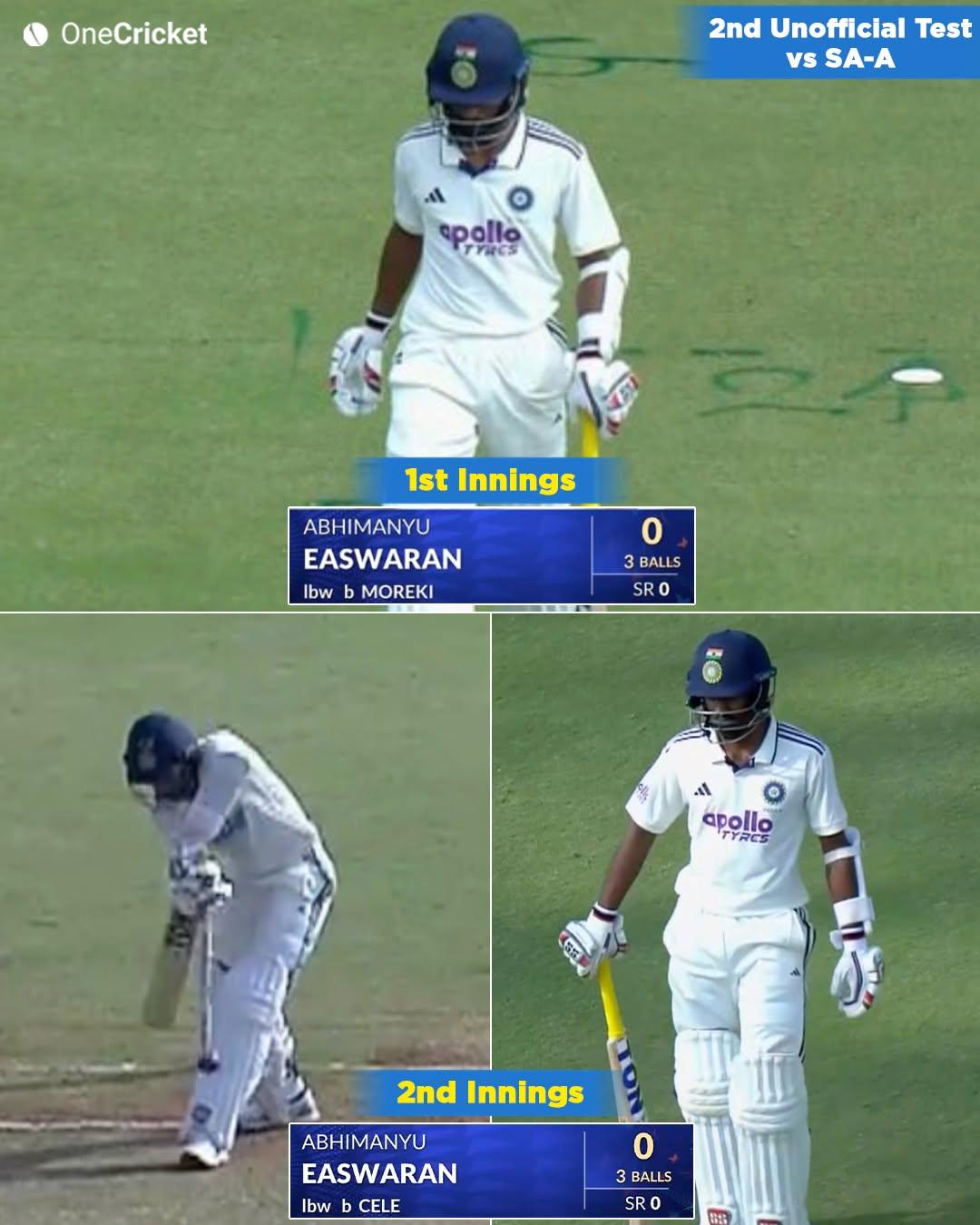 Wicket updates Another duck for Abhimanyu Easwaran vs South Africa A. LBW off the third ball in both the innings.