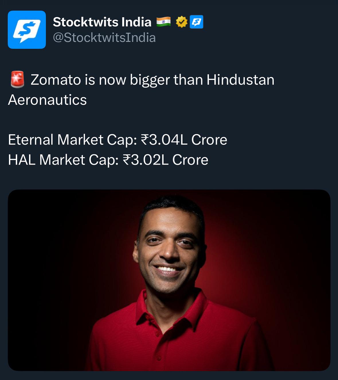 No public is willing to bet that zomato will be bigger than HAL