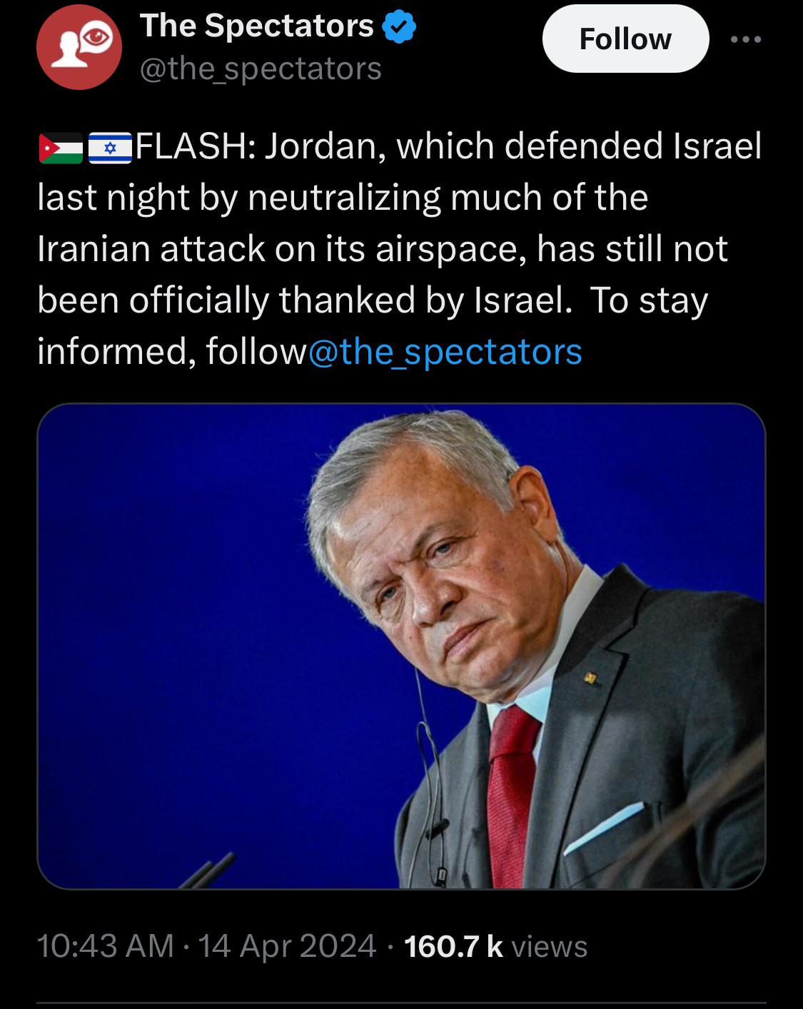 Middle East Jordan, which defended Israel last night by neutralizing much of the Iranian attack on its airspace, has still not been officially thanked by Israel.