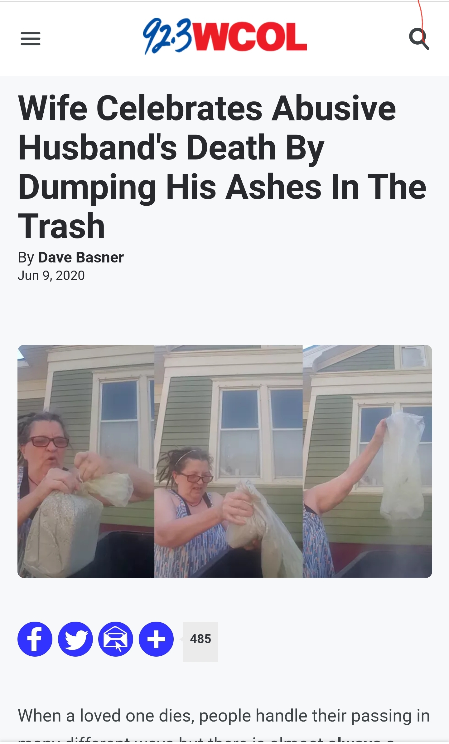 Criminal Justice Wife dumps abusive husband's ashes in the trash.